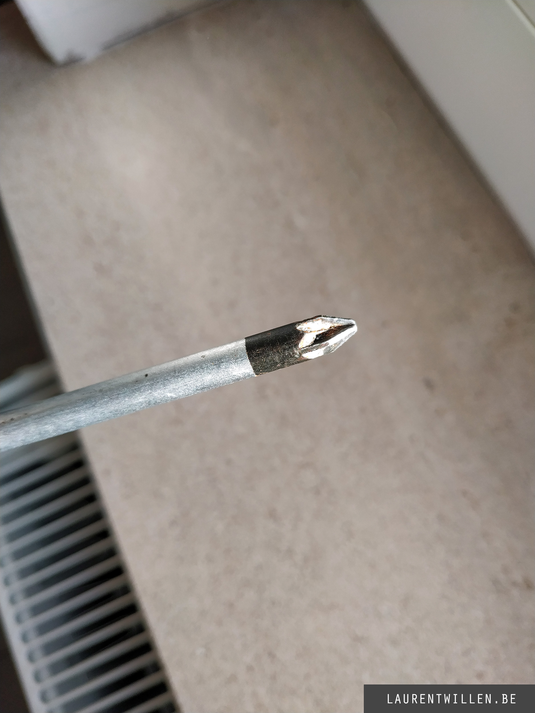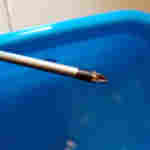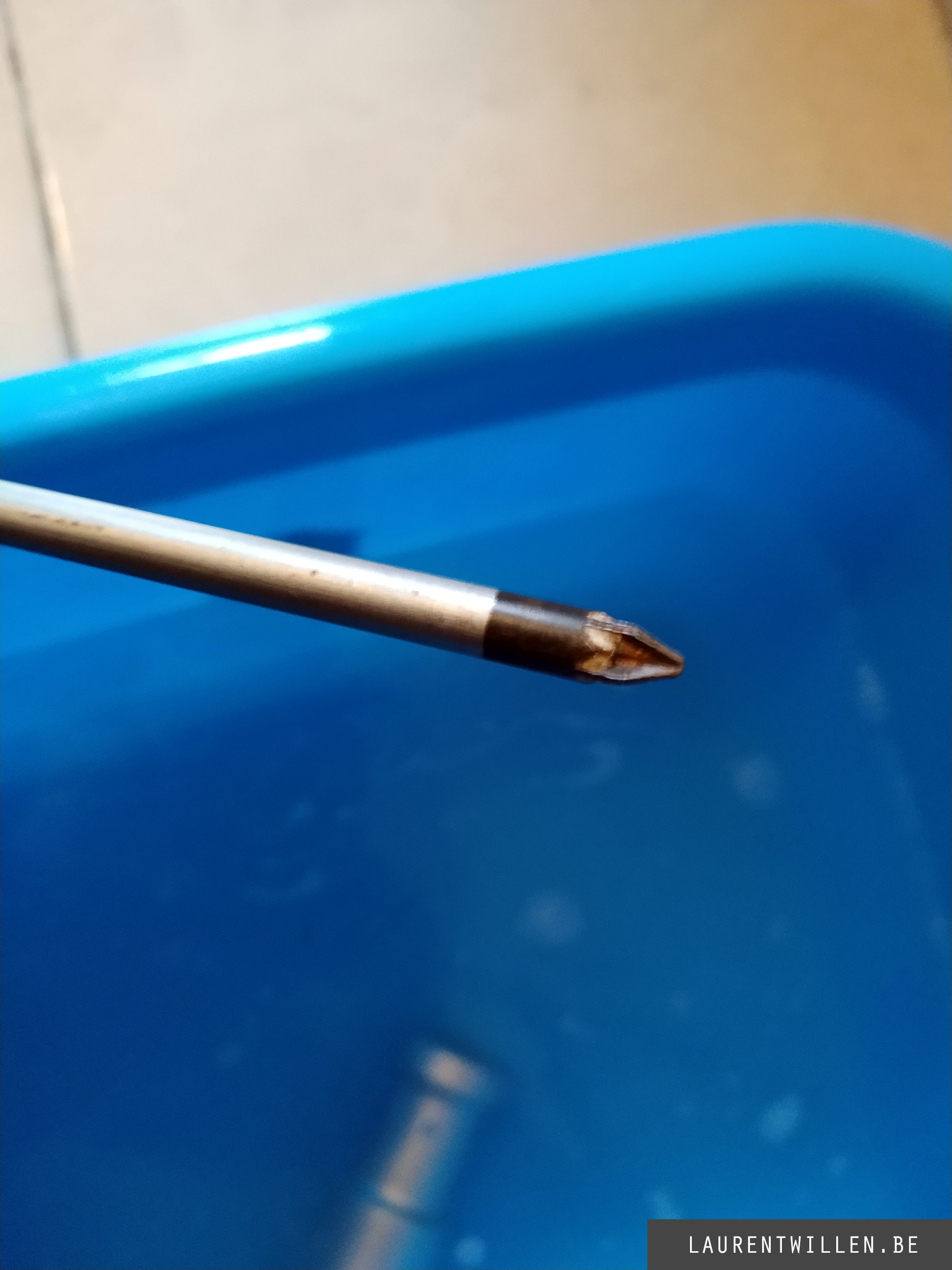Après le mouchoir j'ai voulu tester le Sonic Soak sur un outil alors j'ai pris un de mes tournevis, il avait de la peinture blanche sur la pointe et de la graisse sur le manche. J'ai déposé le tournevis dans l'eau et je l'ai laissé avec le Sonic Soak pendant 720 secondes. Quand j'ai sorti mon tournevis de l'eau, j'ai vérifié s'il y avait une différence et oui, il y avait une différence mais elle n'était pas spectaculaire. Il y avait un peu moins de peinture blanche et le manche était plus lisse, mais les taches les plus importantes étaient encore présentes.