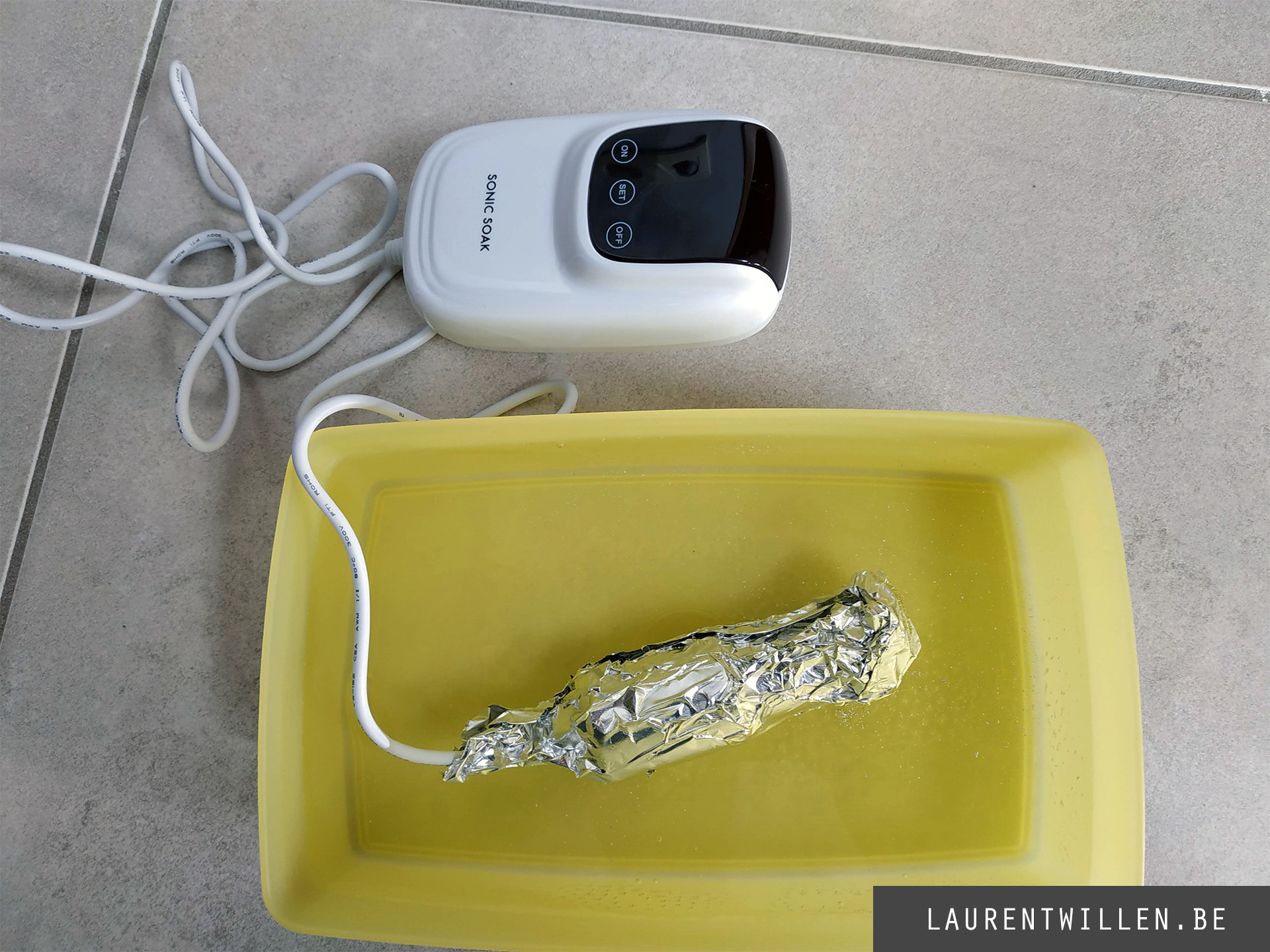 J'étais vraiment excité à l'idée de tester ce nouveau produit alors j'ai ouvert la boîte, lu attentivement les instructions d'installation et commencé mon premier test. Pour voir si l'appareil fonctionne, vous devez l'envelopper dans une mince feuille d'aluminium et placer l'appareil à ultrasons dans un récipient d'eau. L'objectif de ce test est de voir si l'appareil fonctionne bien, les ultrasons devraient créer des trous dans le pli en aluminium. Après l'emballage, j'ai soigneusement mis l'appareil dans l'eau et je l'ai allumé. Il se met à bourdonner et j'entends la feuille d'aluminium se fendre littéralement, je pouvais voir de la poussière d'aluminium apparaître au fond du récipient, tout semblait fonctionner comme prévu jusqu'à ce que j'entende un grand bang au niveau de l'alimentation. L'appareil est mort seulement 1 minute après avoir commencé à fonctionner. J'ai essayé l'appareil dans une autre prise de courant, j'ai répété l'opération à différents endroits dans ma maison, l'appareil est clairement mort. Mon installation électrique à la maison est neuve, le problème ne vient certainement pas de là. Maintenant, la seule chose que je peux faire est de contacter Sonic Soak et nous verrons à quelle vitesse ils peuvent réagir.