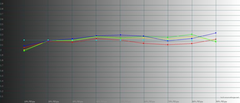 Les niveaux de gris sont également très bien rendu avec un gamma de 2.22 avec parfois des écarts sur certaines valeurs mais en moyenne les gris sont très bien rendu. Le contraste est également excellent, j'ai mesuré un contraste de 2364:1, c'est un niveau de contraste élevé pour un écran de type LCD IPS.