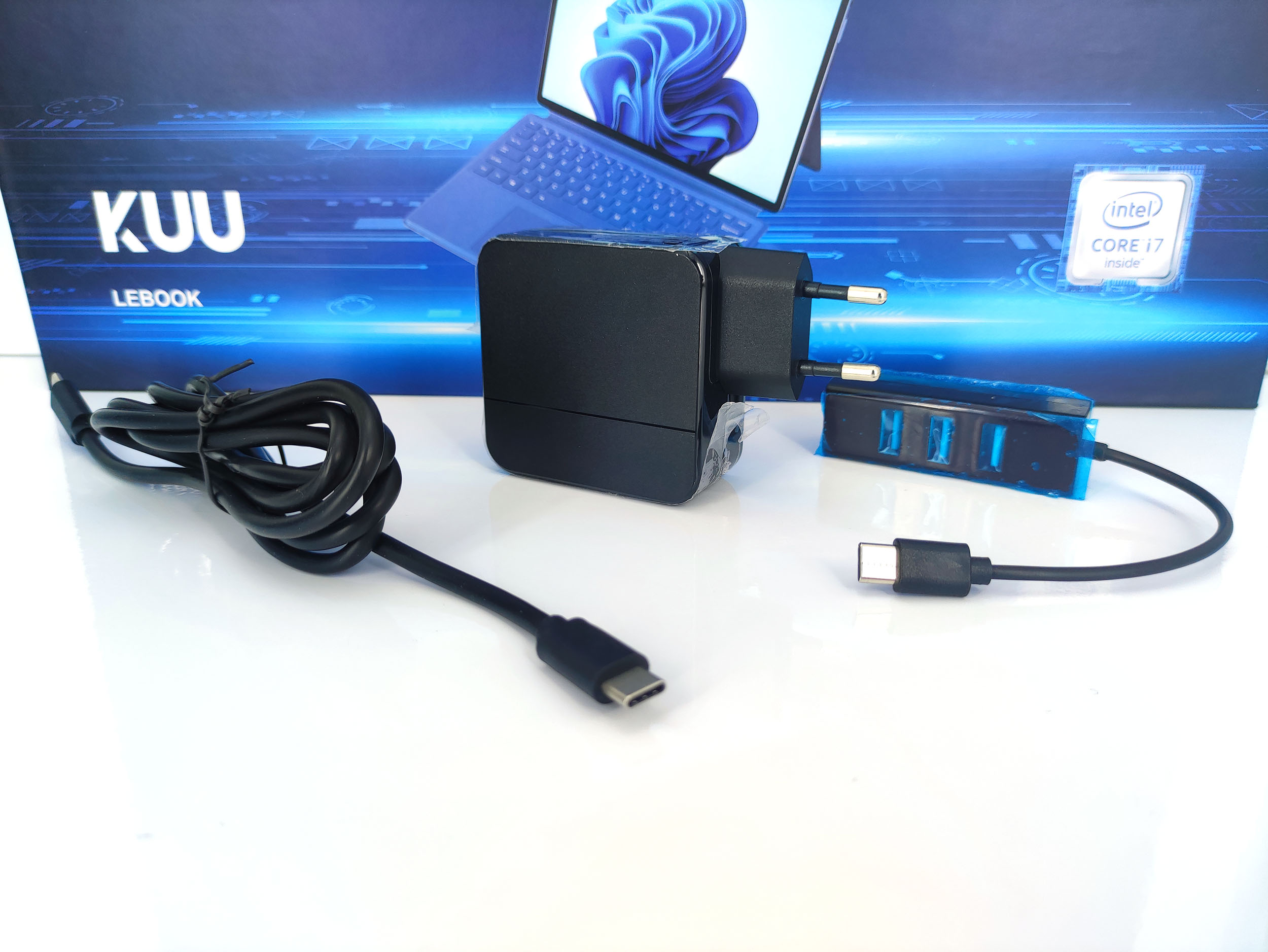 Les deux ports USB-C situés en haut à gauche du KUU sont des ports USB3 et ils peuvent également être utilisés pour recharger l'ordinateur avec une charge rapide de 45W en Power Delivery, un chargeur compatible est livré dans la boite.