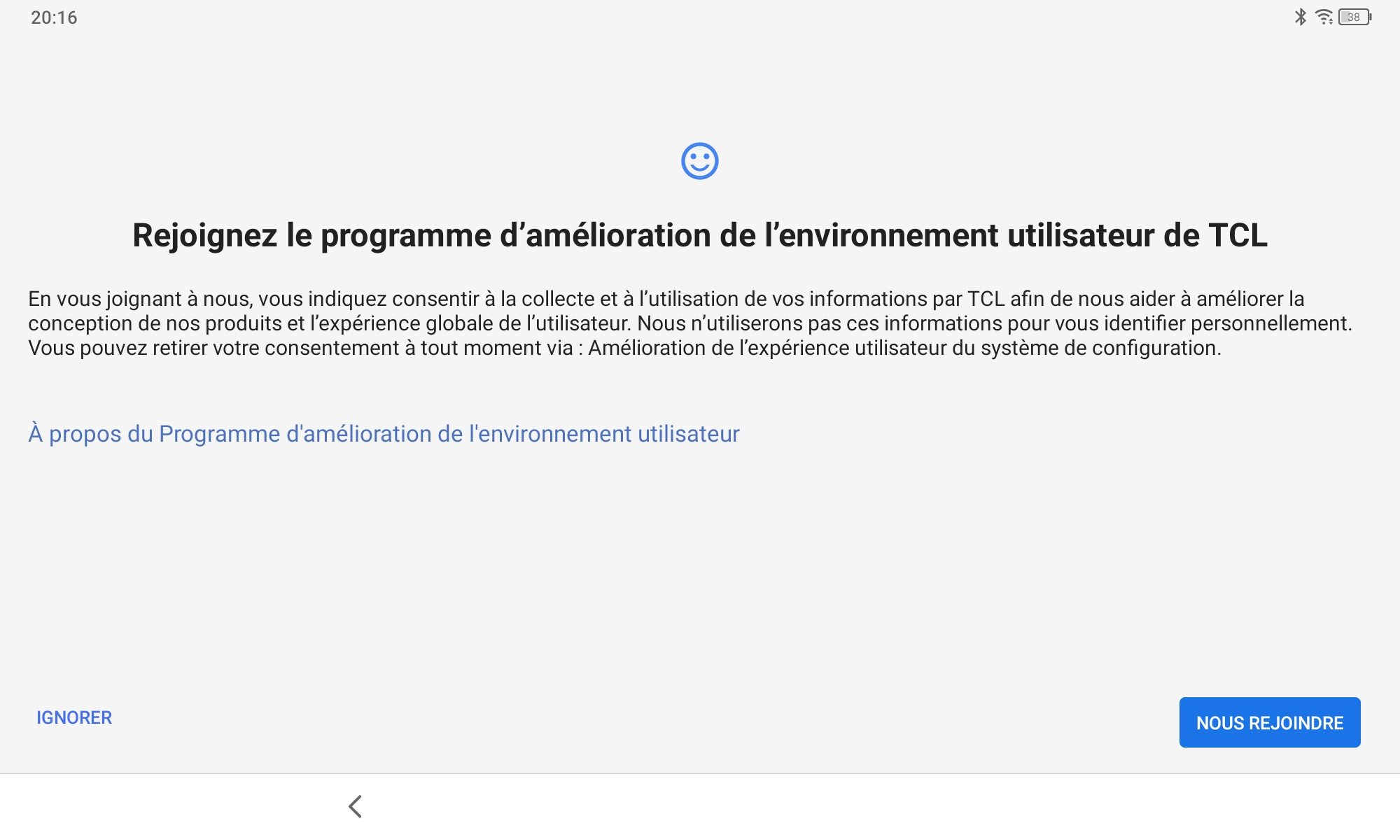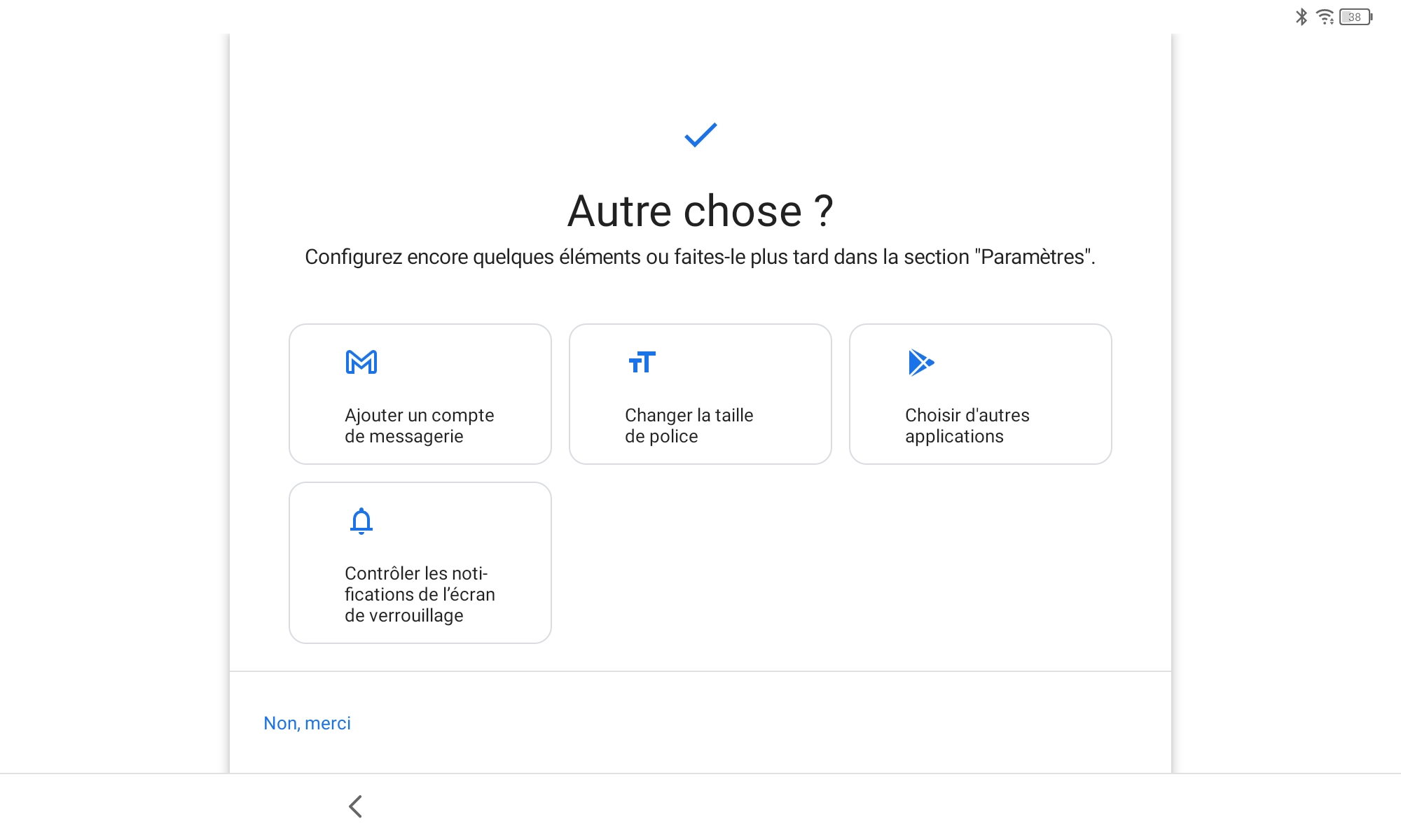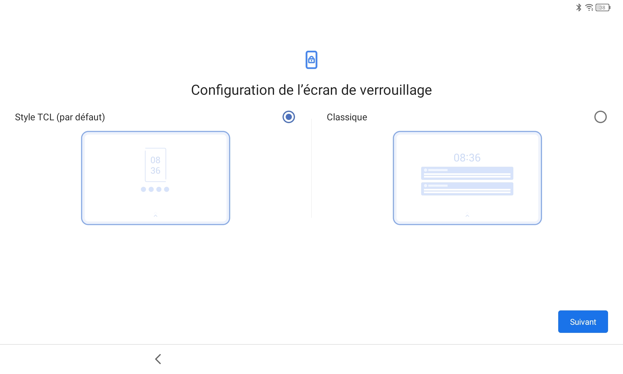 La configuration de la tablette passe par les mêmes écrans que la plupart des smartphones sous Android, c'est seulement à la fin du parcours habituel que TCL a ajouté quelques écrans pour notamment configurer l'écran avec leur solution NXT Vision, ensuite proposer deux styles d'écran d'accueil, deux styles d'écran de verrouillage et ensuite accepter les conditions générales TCL.Finition