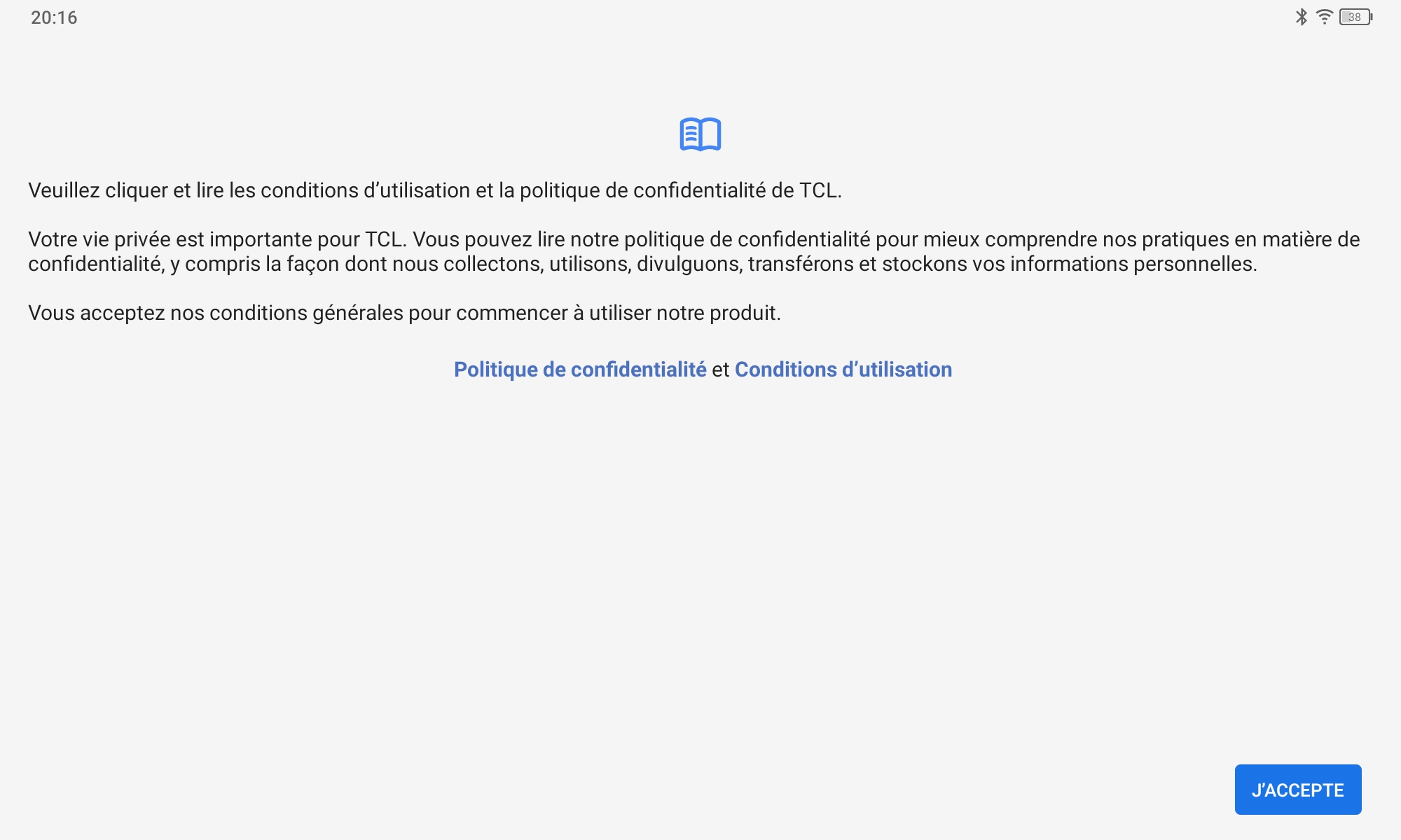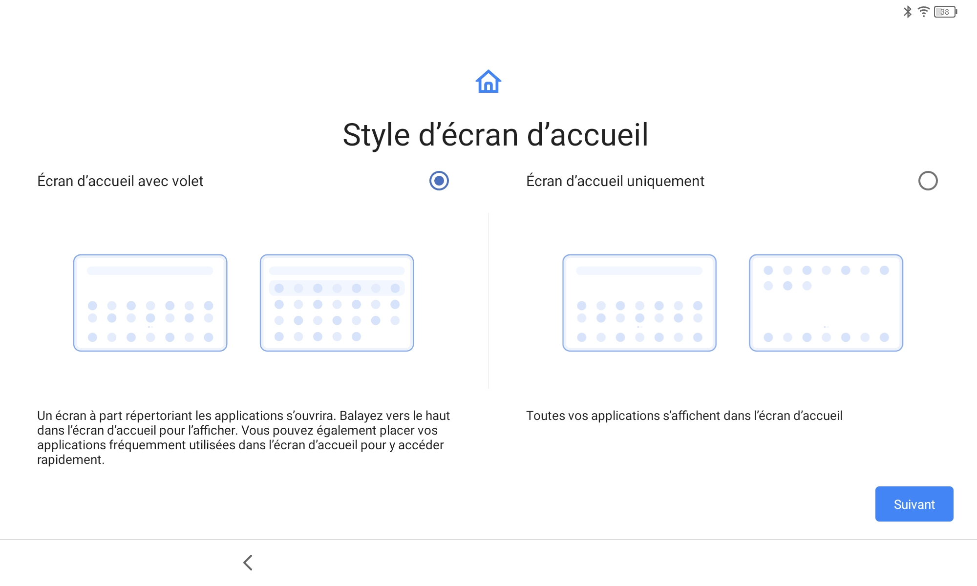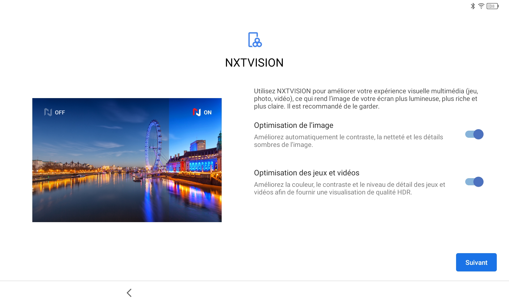 La configuration de la tablette passe par les mêmes écrans que la plupart des smartphones sous Android, c'est seulement à la fin du parcours habituel que TCL a ajouté quelques écrans pour notamment configurer l'écran avec leur solution NXT Vision, ensuite proposer deux styles d'écran d'accueil, deux styles d'écran de verrouillage et ensuite accepter les conditions générales TCL.Finition