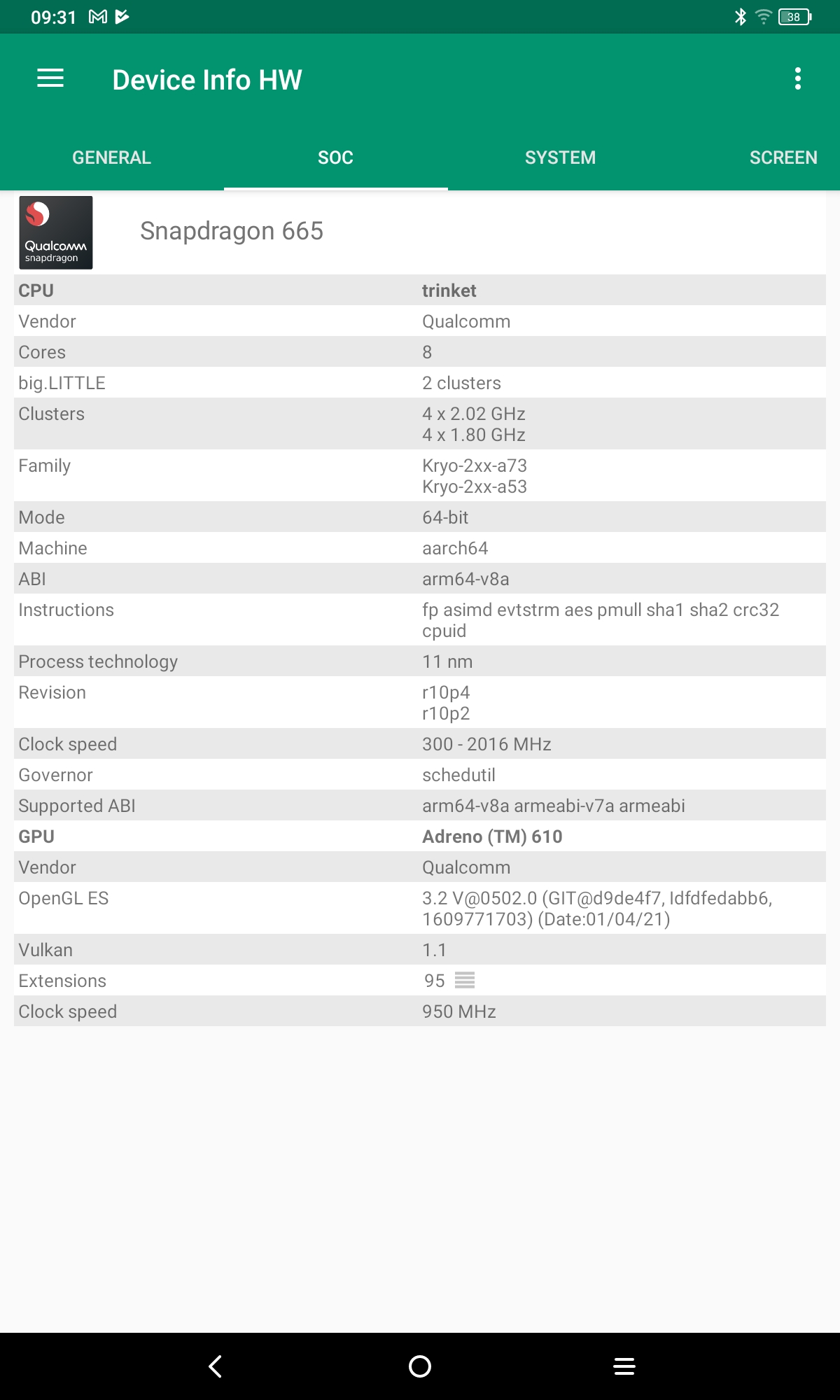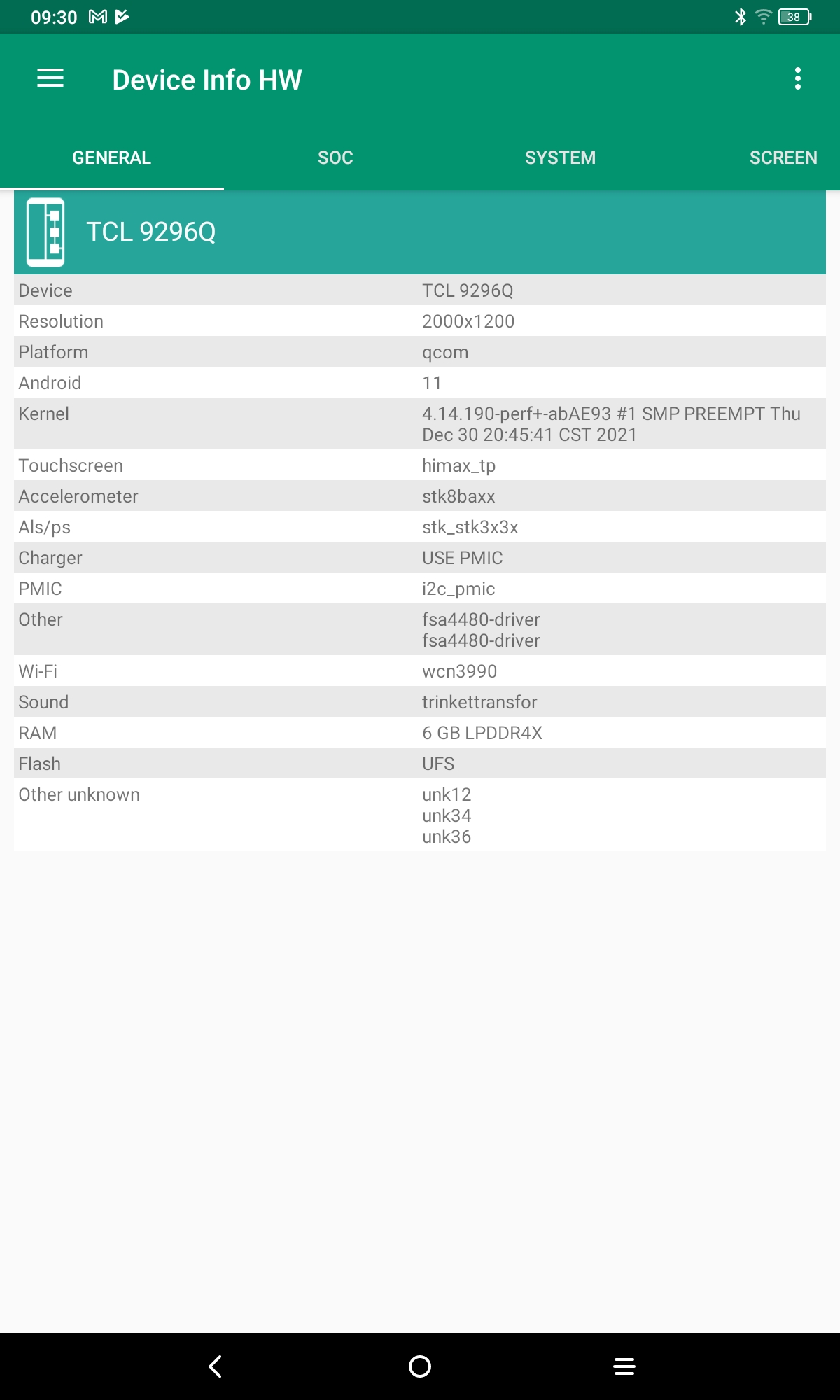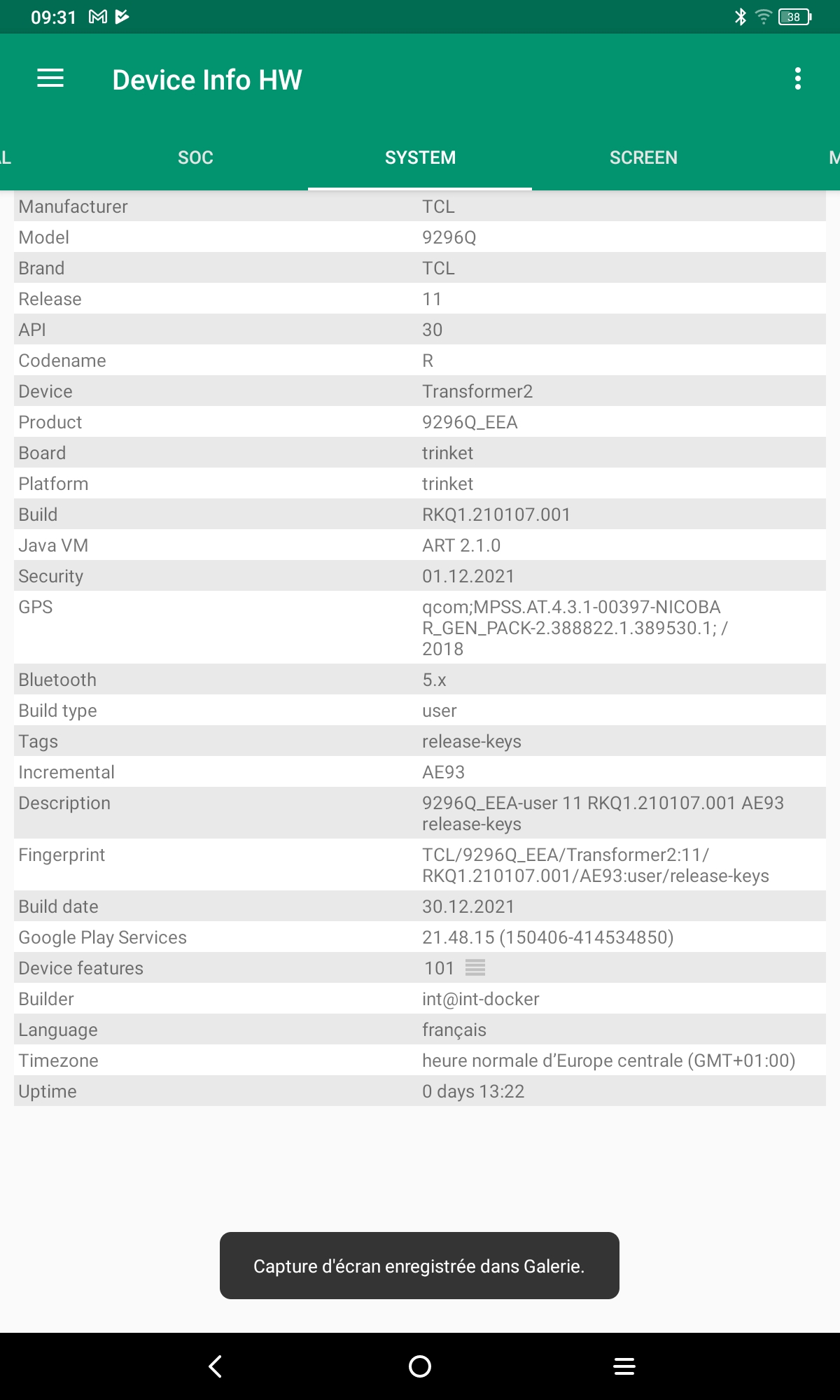 Les informations ci-dessous proviennent de l'application Device Info HW. L'application fournit des informations techniques détaillées sur le téléphone testé.La TCL 10 Tab Max tourne sur une architecture Qualcomm, elle partage donc de nombreux éléments communs avec les smartphones utilisant la même architecture. Le chipset wifi est par exemple assez répandu dans la gamme Poco, j'avais d'ailleurs obtenu de très bons résultats en matière de sensibilité et vitesse. Cette version 9296Q de la tablette tourne sous Android 11 (la version précédente tournait sous Android 10). L'écran a une résolution de 2000x1200 avec une fréquence de 60hz.