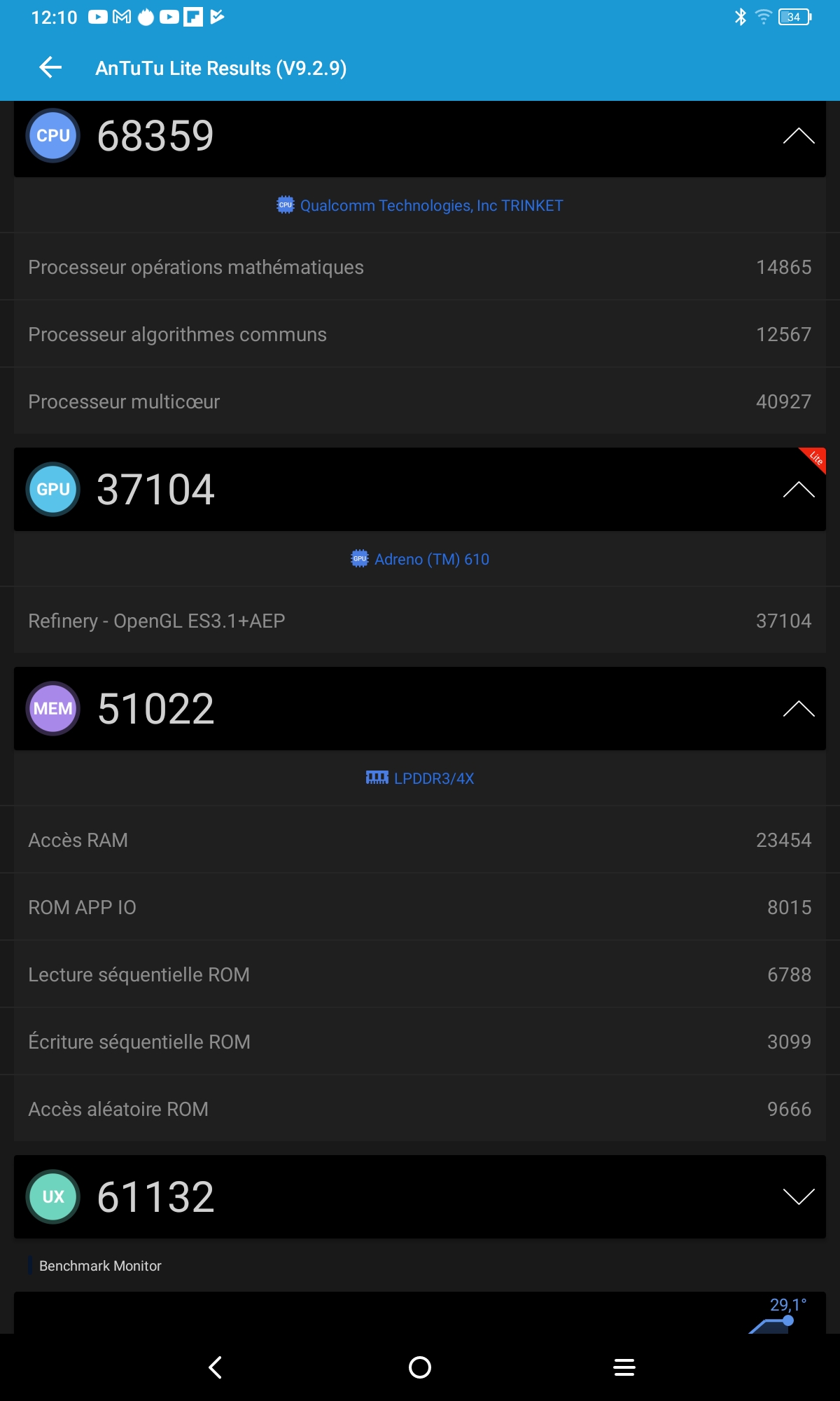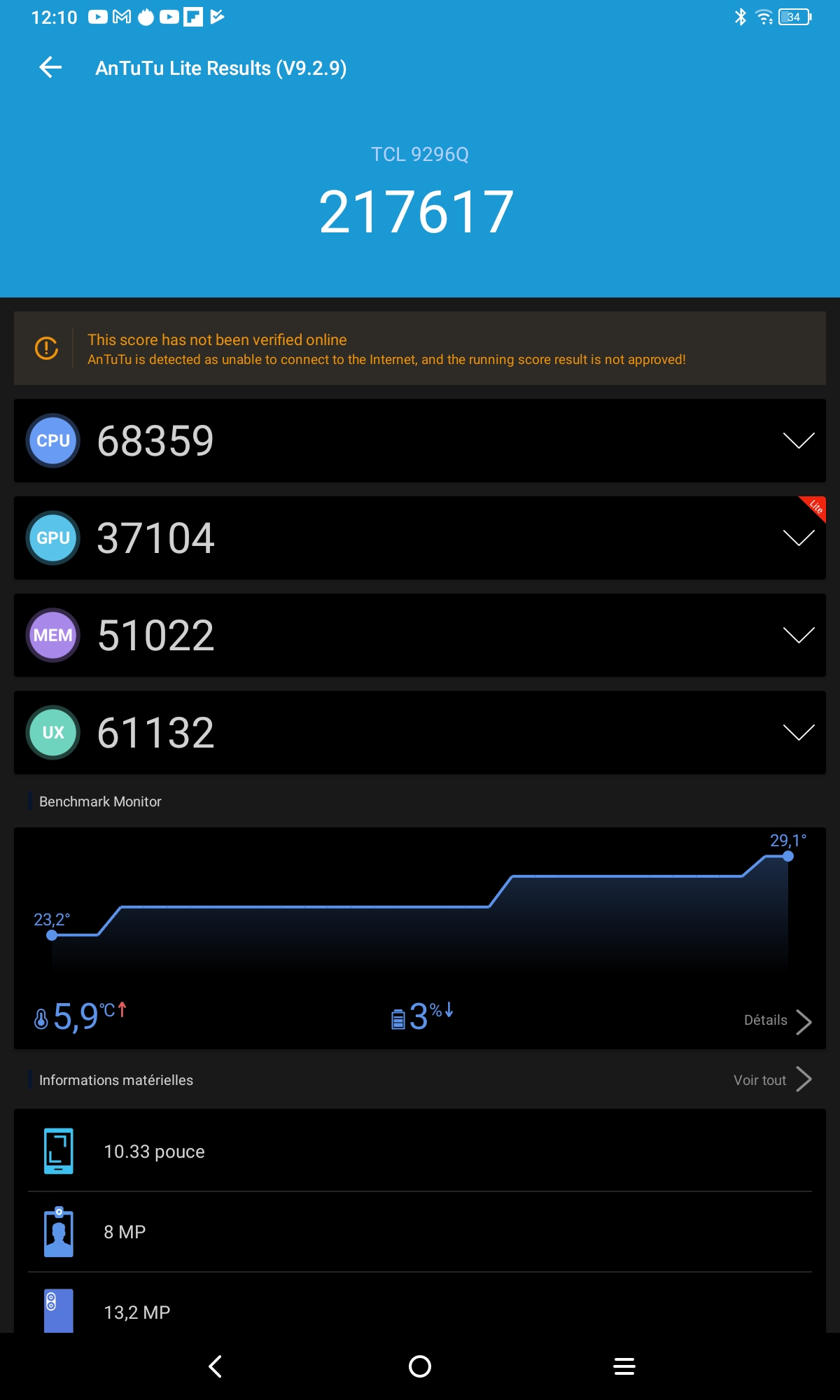J'ai obtenu un score de 217617 points avec Antutu v9, c'est un score assez moyen mais tout à fait normal pour cette gamme de prix et c'est d'ailleurs un meilleur score que la Teclast T40 Plus ou la Chuwi Hipad.Gaming