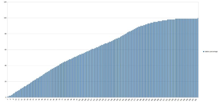 Il m'a fallu 264 minute spour charger la batterie de 0 à 100%, cela peut paraitre assez long mais il ne faut pas oublier qu'il s'agit d'une batterie de 8000 mAh, il faut donc du temps pour la charger complètement. La charge n'est cependant pas linéaire, il faut 37 minutes pour les 20 premiers pourcents mais je vois un premier ralentissement vers 40%, un second vers 80%. Les 20 derniers pourcents prennent plus de 100 minutes.