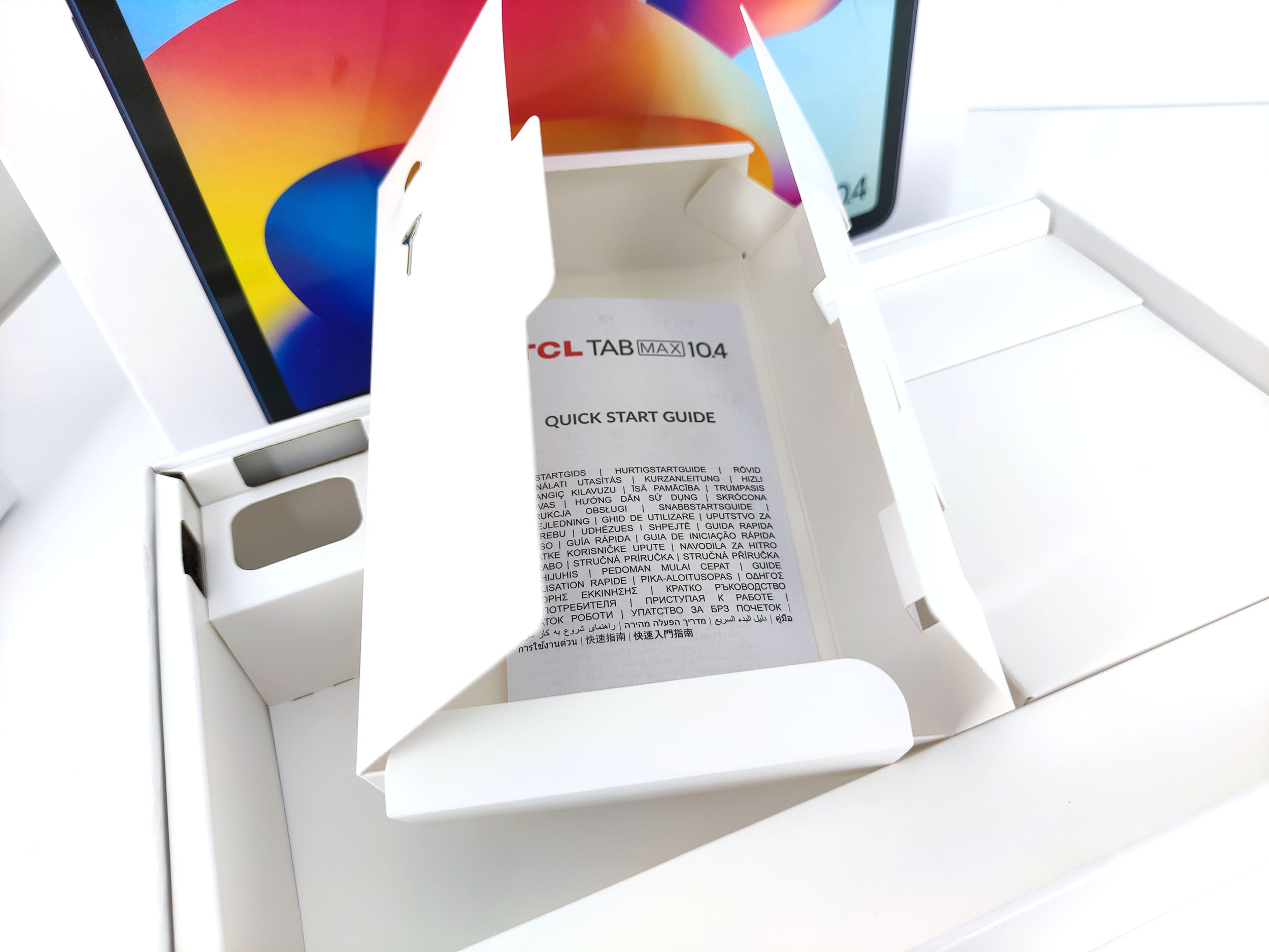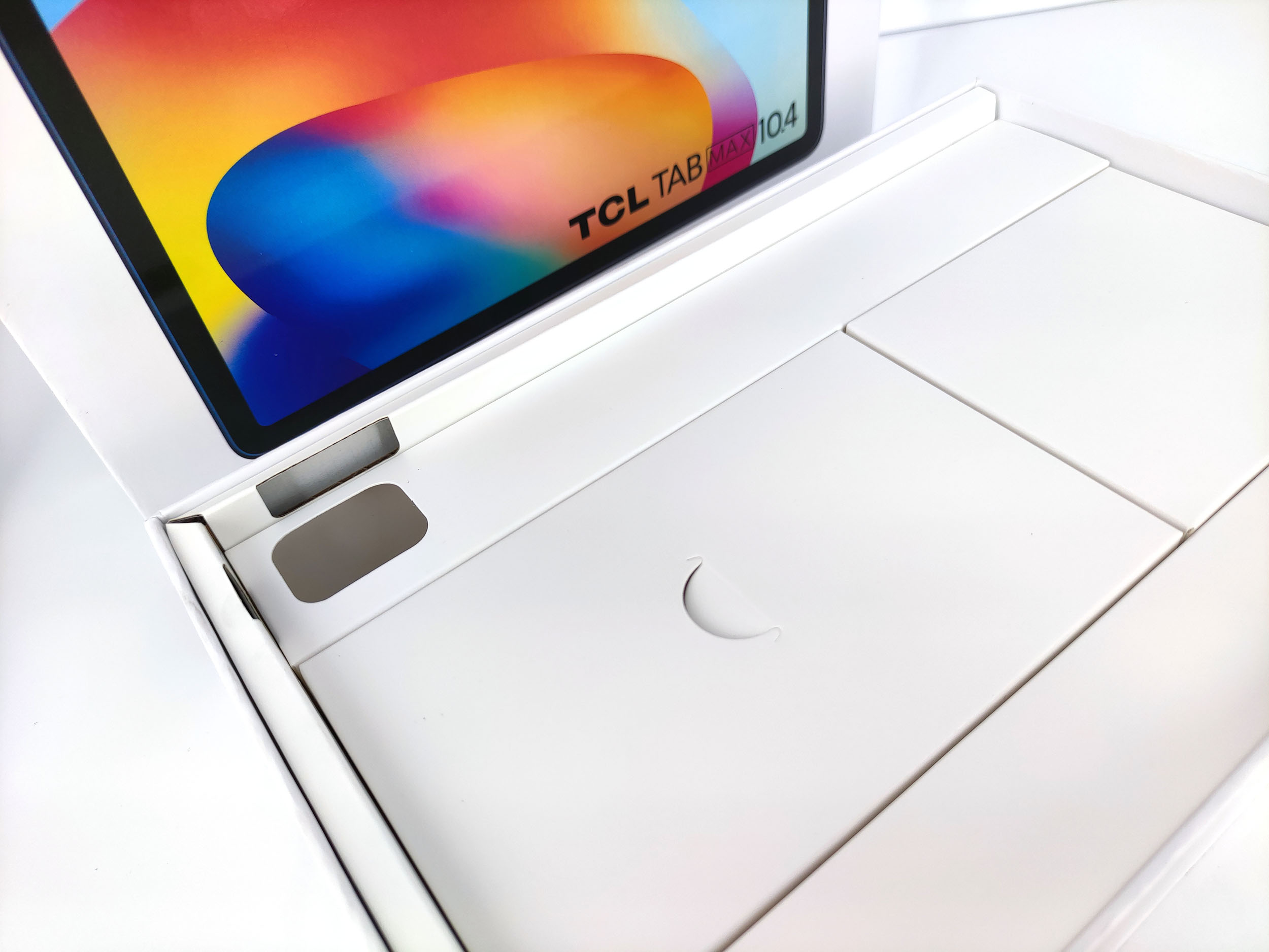 La tablette TCL 10 Tab Max est emballée dans une boite blanche avec une photo du produit, c'est un style très répandu qui me fait notamment penser au packaging de chez Xiaomi. La boite contient la tablette, un manuel, une aiguille pour ouvrir le tiroir SIM, un chargeur et un cable usb type C. La boite est assez épaisse par rapport à la tablette, elle contient de grands espaces vides.