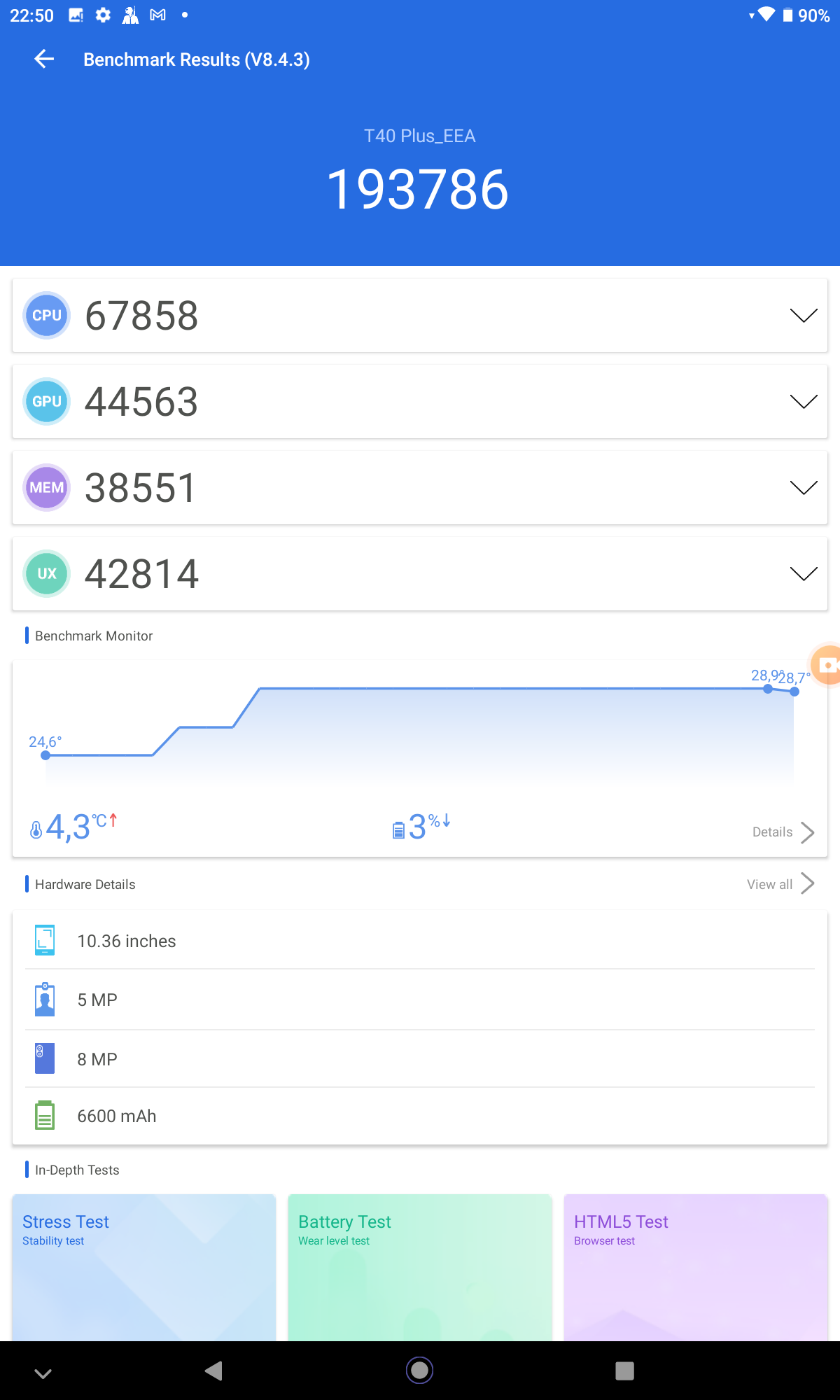 J'ai obtenu un score de 193786 points avec Antutu, ce n'est pas un score extraordinaire, la Teclast offre une performance similaire à un Poco M3, un Redmi Note 9 ou un Umidig Bison. Ce niveau de performance est suffisant pour offrir une expérience au quotidien tout à fait satisfaisante mais cette tablette n'est pas conçue pour les hard core gamers même si elle pourra faire tourner la plupart des jeux simples sans aucun problème. Je n'ai pas remarqué de ralentissement sur un usage de base (surf sur internet, vidéo youtube, ...), j'ai juste parfois remarqué un décalage entre le son des touches du clavier et l'affichage de celles-ci.Gaming