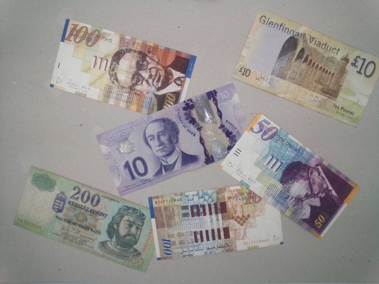 Sur cette photo on se rend encore mieux compte de la perte de détail. Au centre, le billet canadien est plus net que le billet hongrois en bas à droite. Les traits du visage sur le billet hongrois sont complètement lissés et le texte se mélange dans une bouillie de pixels. Les couleurs ne sont pas trop mauvaises mais je ferais une mesure séparée pour les couleurs.