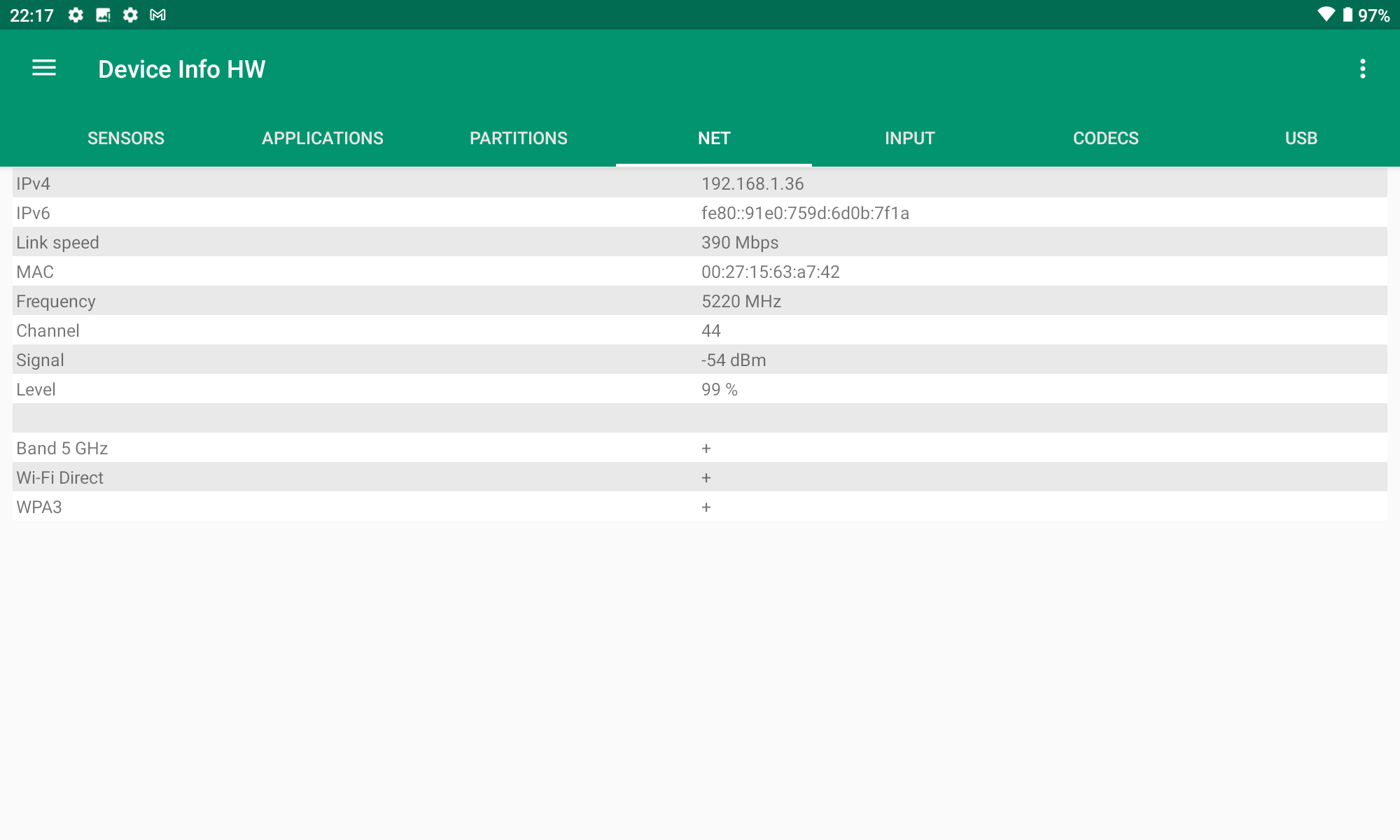 J'ai mesuré un signal de -25 dBm à proximité de mon routeur et un signal de -67 dBm à distance. Ce sont des valeurs dans la moyenne de ce que je mesure habituellement, la sensibilité au signal wifi n'est donc ni extraordinaire ni mauvaise.