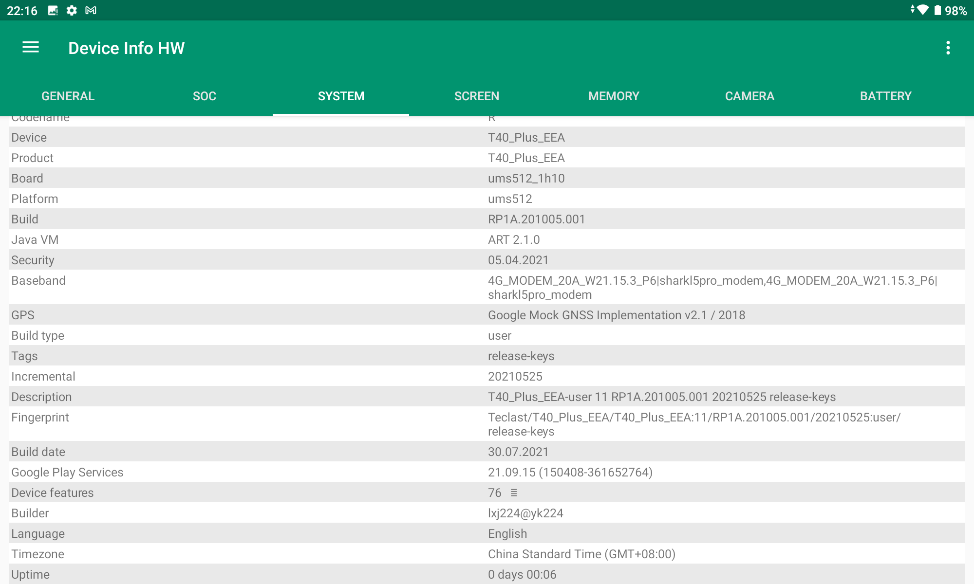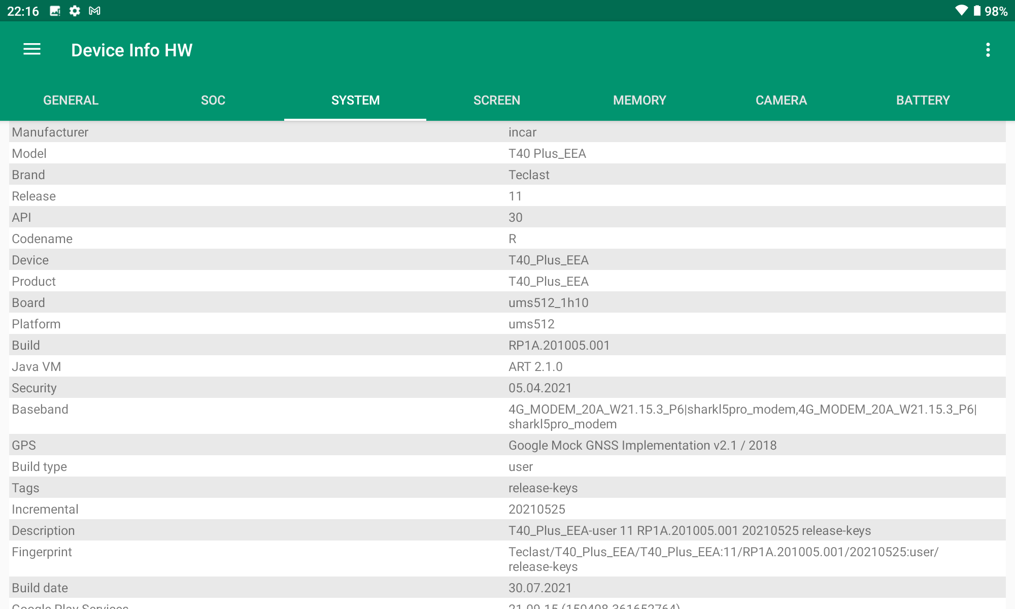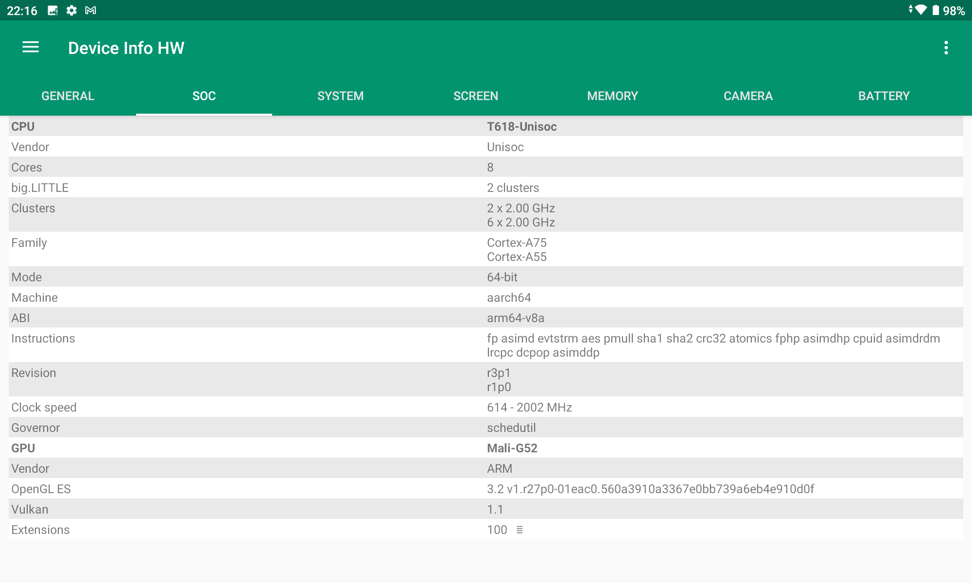 Les informations ci-dessous proviennent de l'application Device Info HW. L'application fournit des informations techniques détaillées sur le téléphone testé.Je ne teste pas beaucoup de tablettes et les composants de cette Teclast semble dans la grande majorité être spécifiques à cette tablette. La comparaison avec d'autres tablettes ou d'autres smartphones est donc plus compliquée. Le CPU est d'un type que je n'ai pas encore testé et de ça découlent d'autres choix comme notamment le chipset GPS ou le modem 4G qui proviennent de constructeurs que je ne connais pas. Pour les smartphones, la grande majorité des composants sont liés à Qualcomm ou Mediatek mais ici on démarre sur un Unisoc, seul le GPU est une veille connaissance (Mali G52).