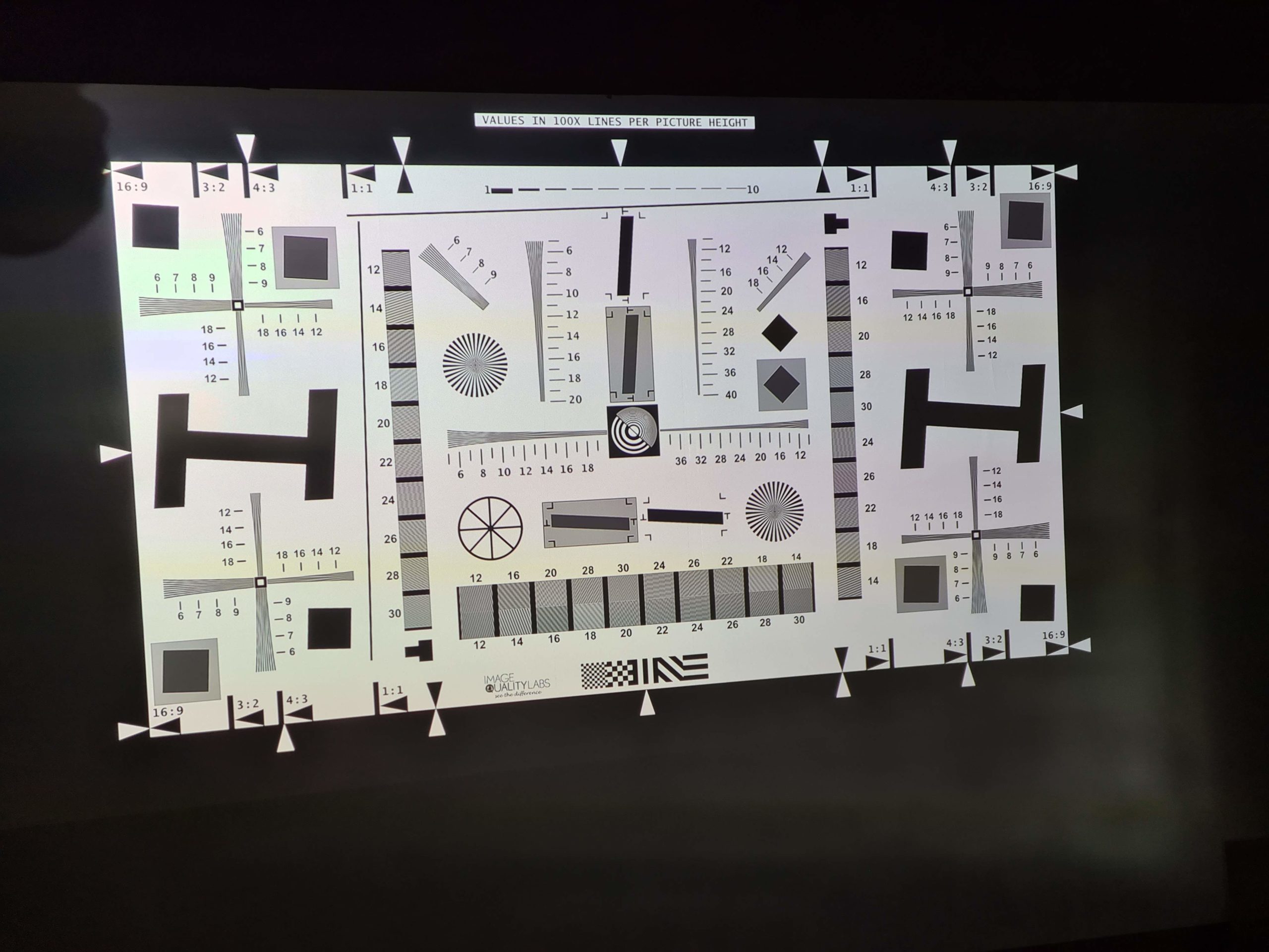 Je teste la netteté de l'image avec une image de type ISO 12233 et j'analyse la netteté au centre et en périphérie. La netteté de ce projecteur est globalement bonne, elle n'est pas forcée et permet de bien distinguer les traits sur toutes les zones de l'écran. J'ai observé quelques traces d'aberration chromatique sur les extrémités mais il faut s'approcher de très près de l'image pour les observer.
