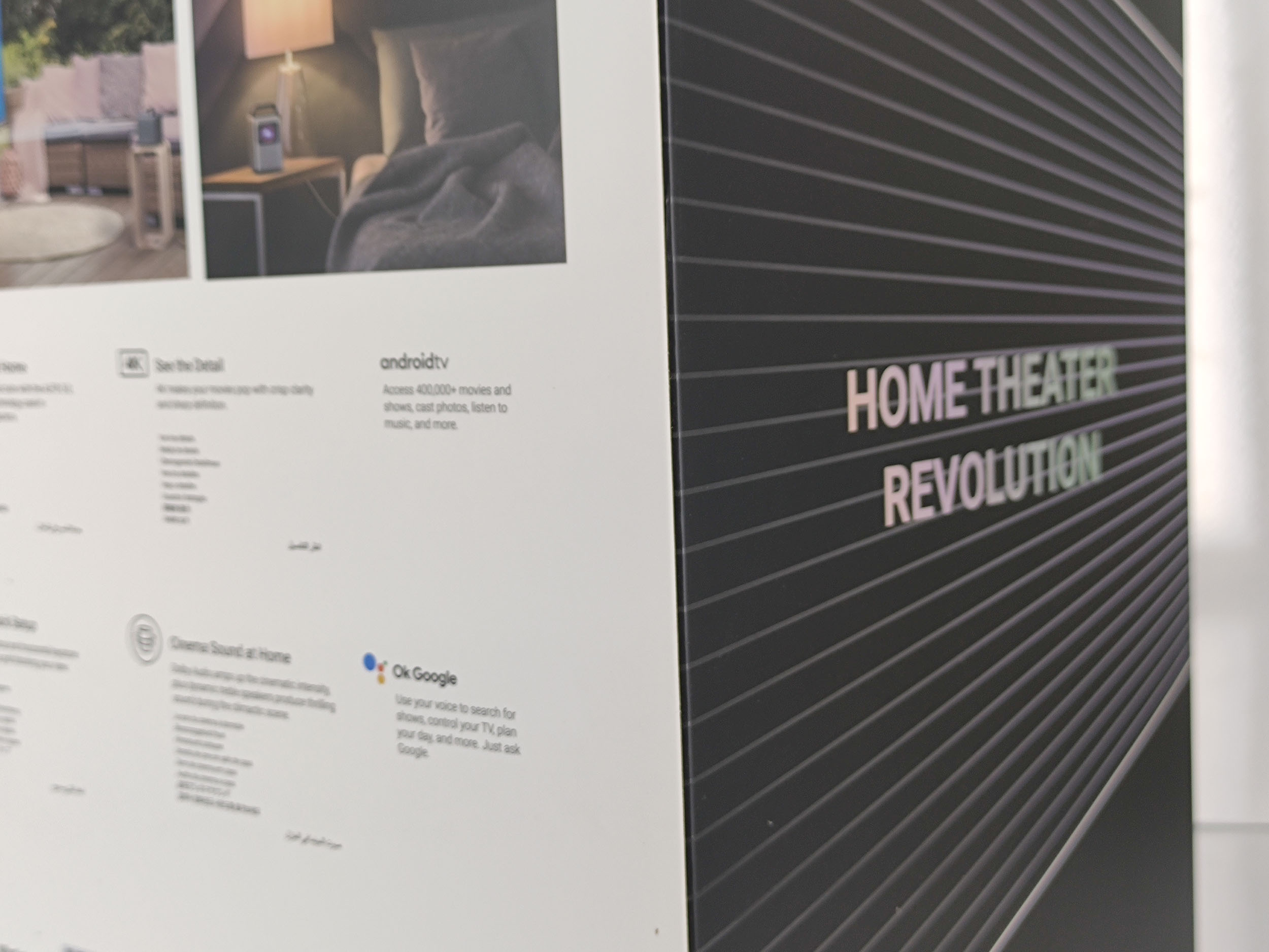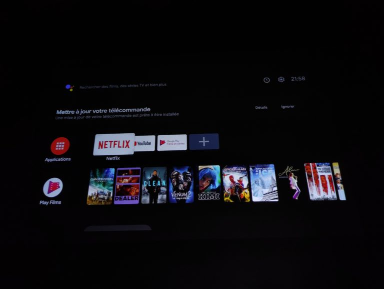La configuration initiale du projecteur suit un processus classique de configuration d'Android TV avec l'association avec la télécommande, la connexion avec le wifi, l'association avec un téléphone et les écrans habituels Google pour finalement arriver sur votre écran d'accueil Android TV.