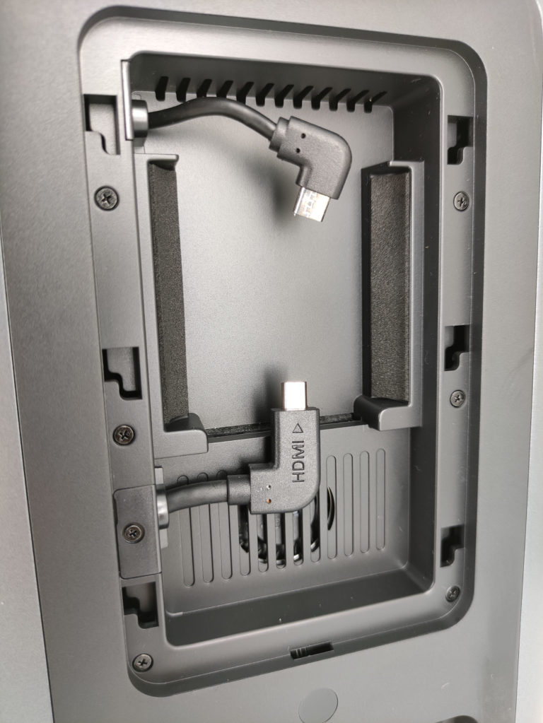 A l'arrière, on retrouve un panneau amovible derrière lequel il faut greffer le dongle avec deux branchements, un pour l'alimentation et un autre pour la sortie audio/vidéo.
