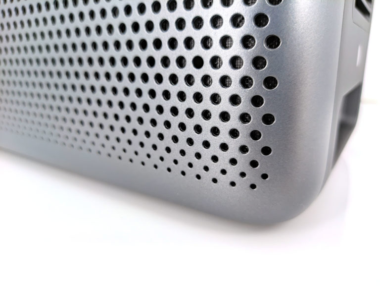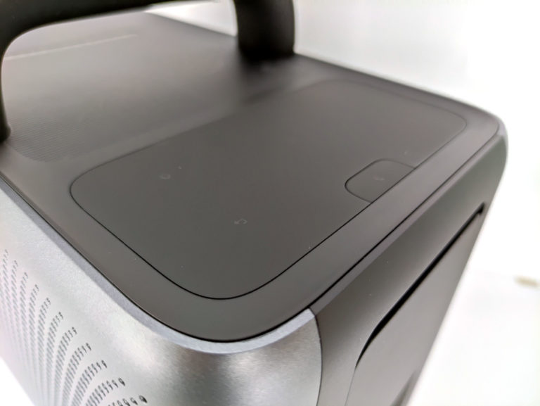 Les parois latérales sont alvéolées pour laisser passer le son et la ventilation, c'est un design assez courant pour les projecteurs mais la couleur gris métallique lui donne un aspect plus premium. Ici aussi la prise en main donne une impression de solidité.