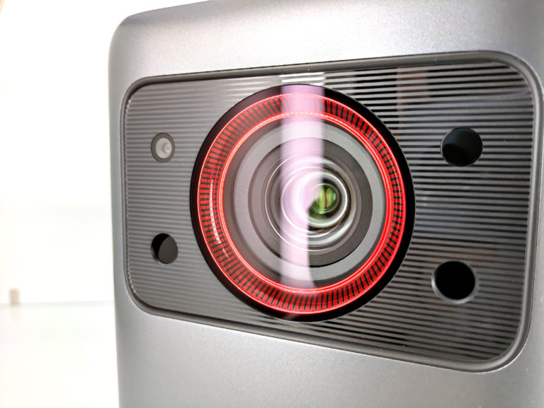 L'énorme lentille est accompagnée de 4 capteurs ou je suppose qu'il s'agit de 4 capteurs, certains sont peut être purement décoratifs. Ces capteurs permettent au projecteur de calculer la profondeur pour effectuer la mise au point de l'image automatiquement. Comme vous pouvez le voir sur cette photo, la lentille est très proche du bord du projecteur, elle est donc exposée au risque d'accrochage.
