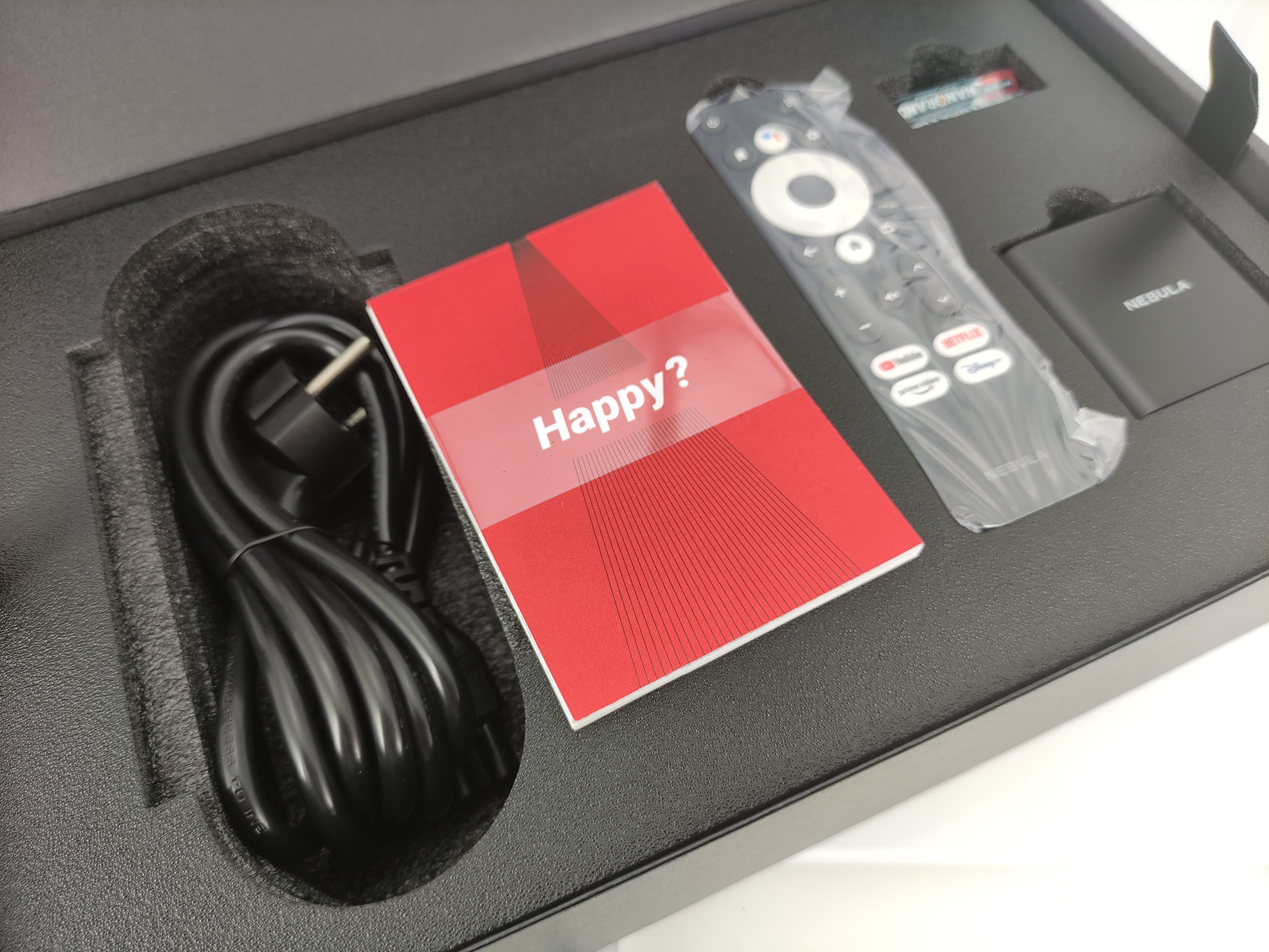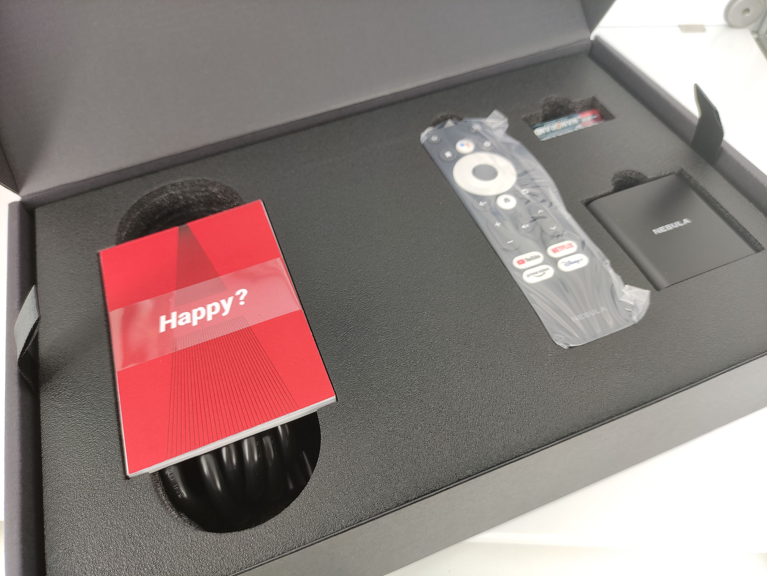 Le Nebula Cosmos Laser 4k est livré dans une belle boite qui ne laisse pas trop de doutes sur le positionnement plutôt premium du projecteur. La boite est conçue en forme de valises avec sa poignée en haut pour pouvoir la transporter plus facilement. Le projecteur est également très bien emballé et protégé par une épaisse couche de mousse noire. Le déballage d'un produit n'est pas une activité vraiment intéressante mais elle est importante pour la perception d'un produit et l'emballage de ce produit donne une impression très positive.