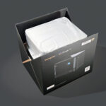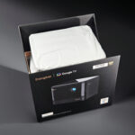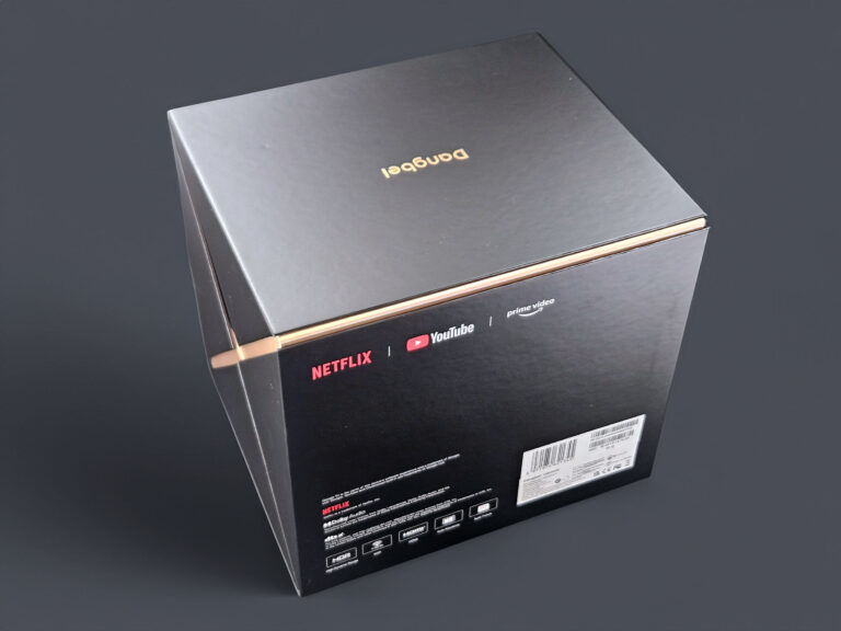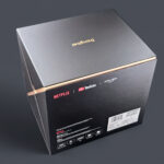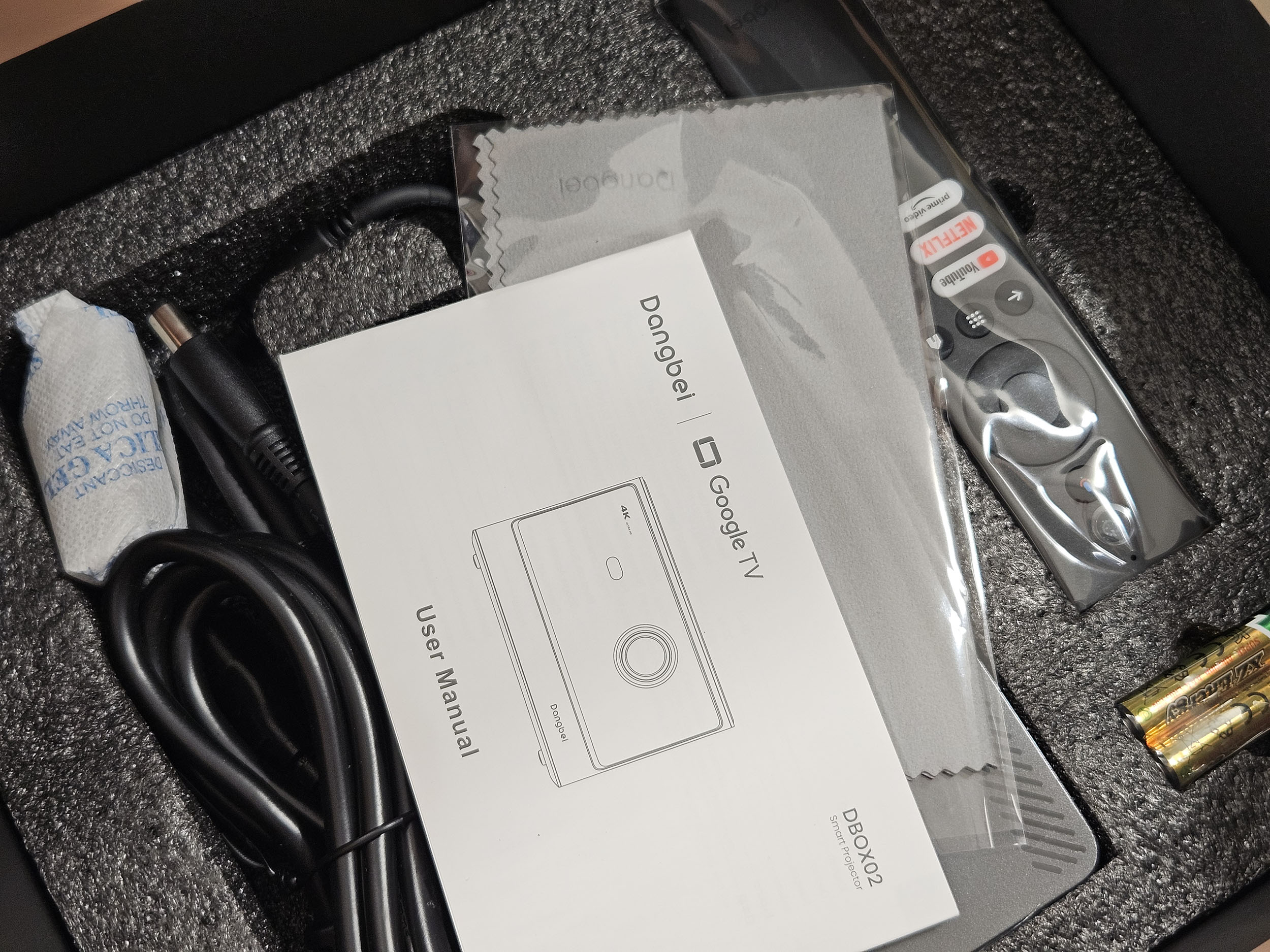 La boite contient le projecteur, un énorme bloc d'alimentation, un chiffon de nettoyage, une télécommande et deux piles. La boite reprend les logos de plusieurs services de streaming avec notamment Netflix ce qui devrait lui assurer un support native de cette plateforme de streaming. Ce n'est clairement pas le cas pour toutes les marques de projecteurs.