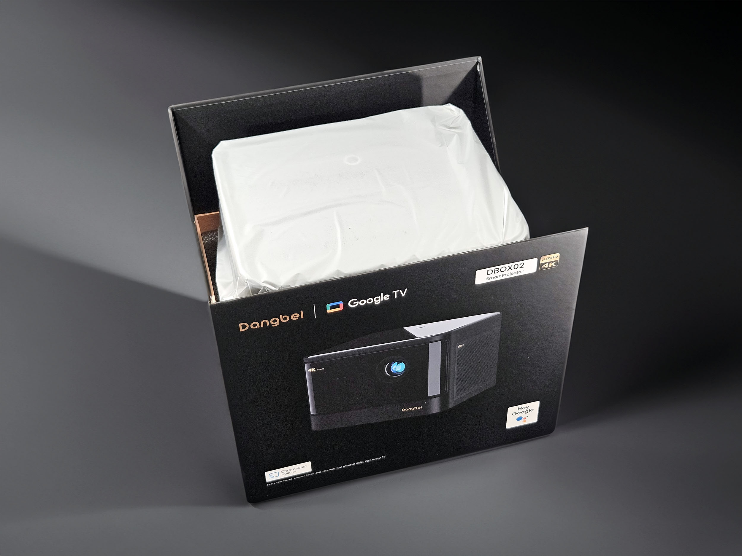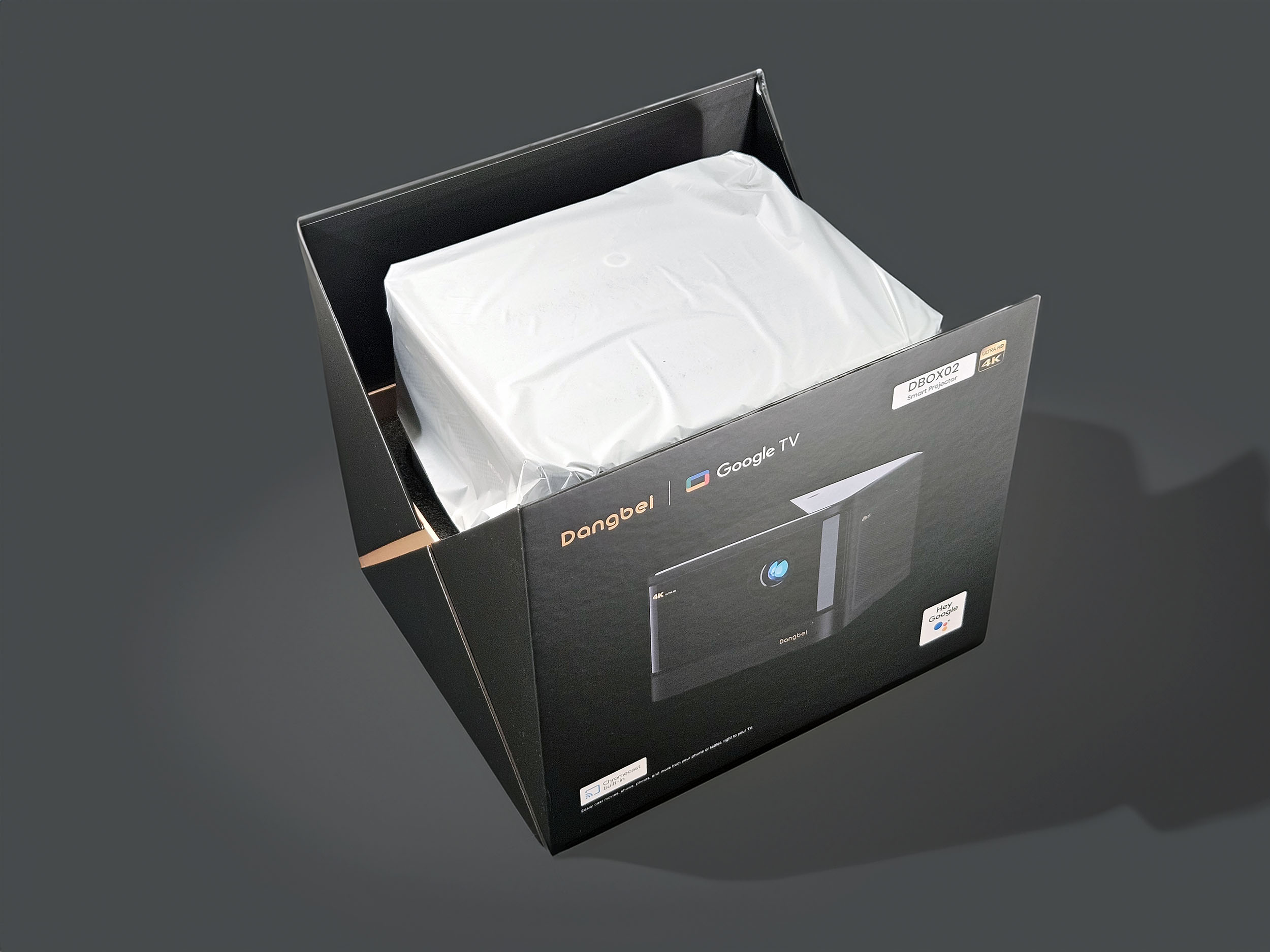 Dangbei n'est peut-être pas une marque très connue auprès du grand public en Europe, ce n'est pas pour autant une marque conçue dans une cave dans le fin fond de la Chine. C'est la boite qui véhicule la première impression lorsque l'on reçoit un projecteur et cette boite donne une très bonne impression. Ce n'est clairement pas le premier produit commercialisé de Dangbei et on sent une maitrise de l'image de marque.