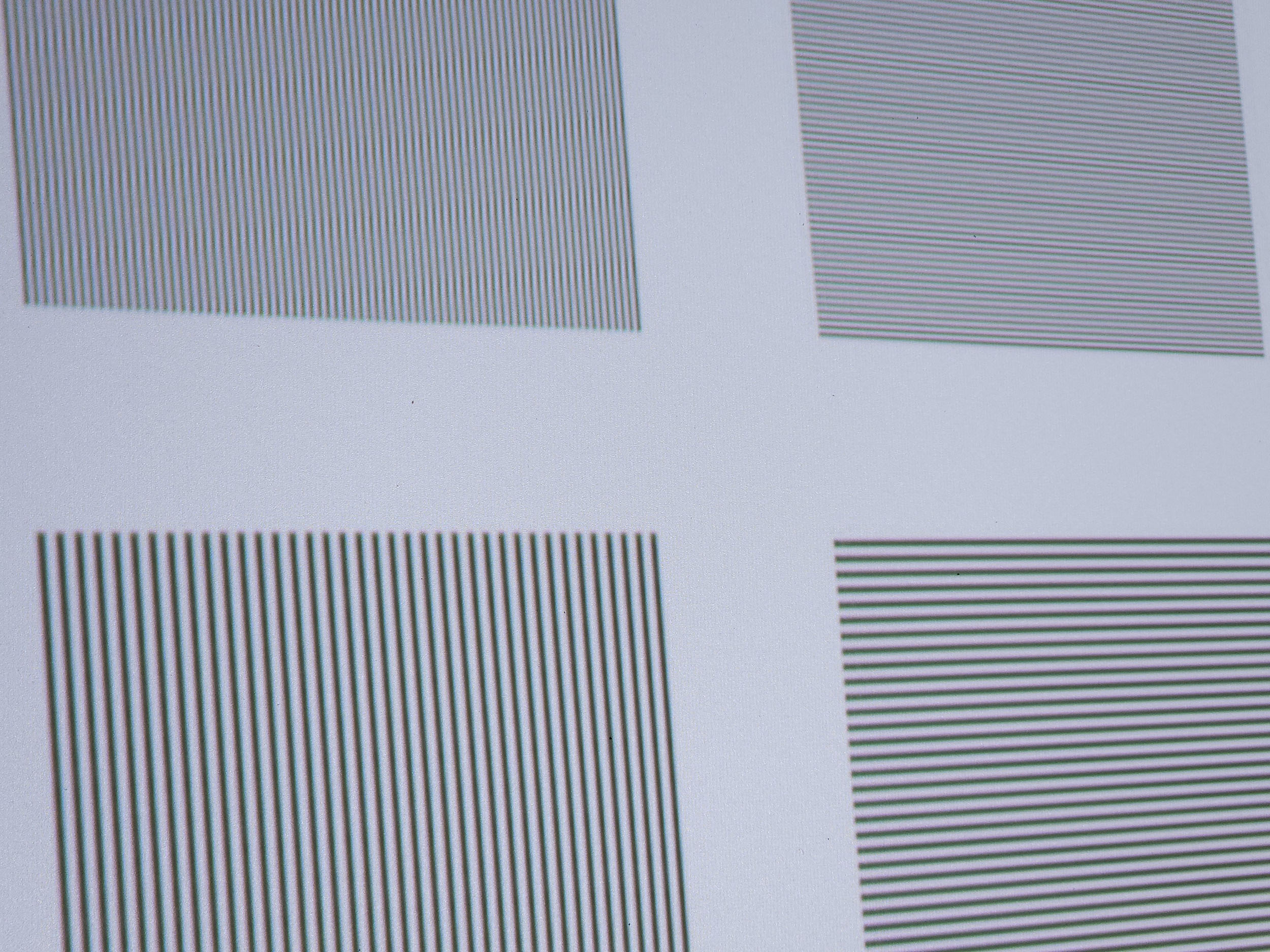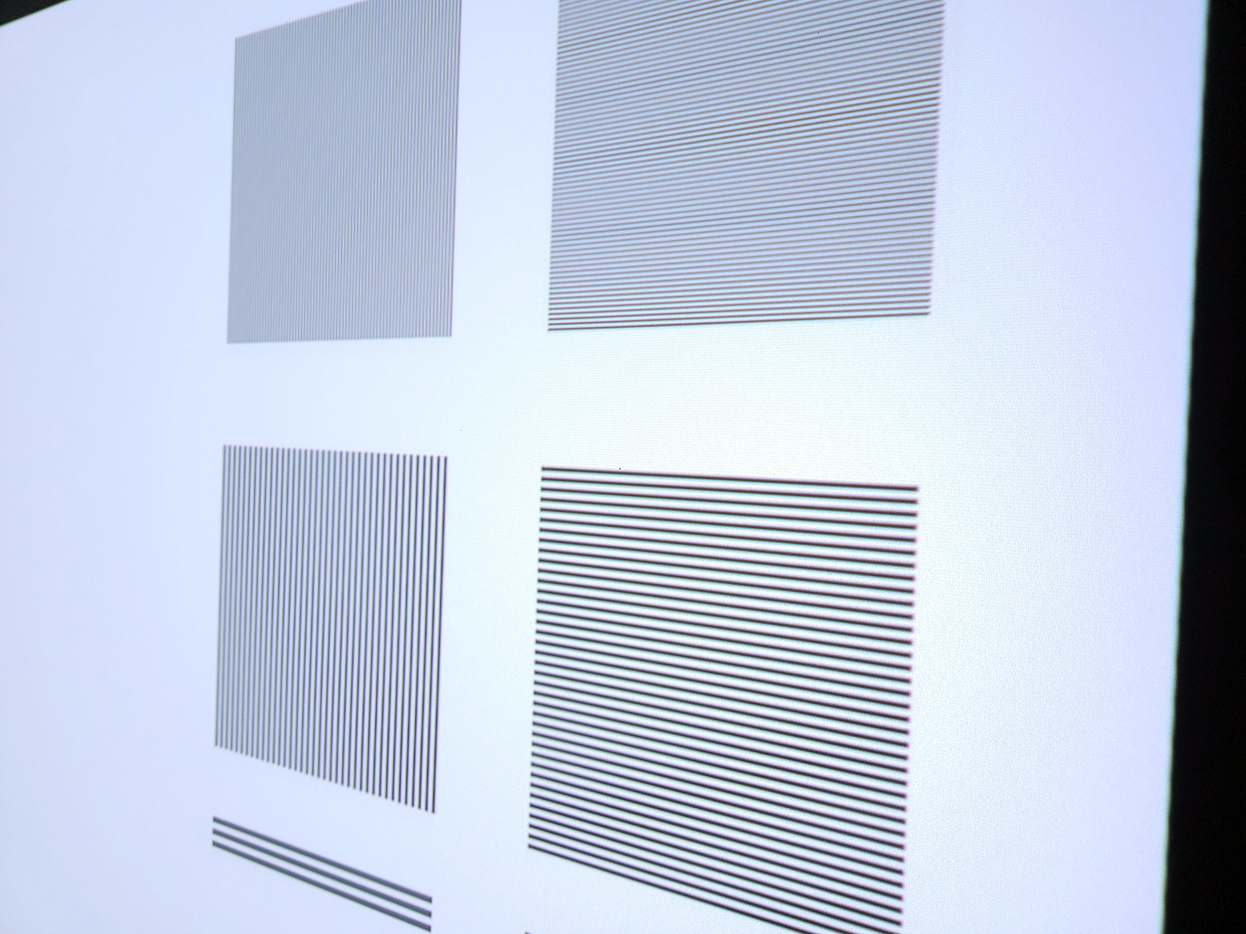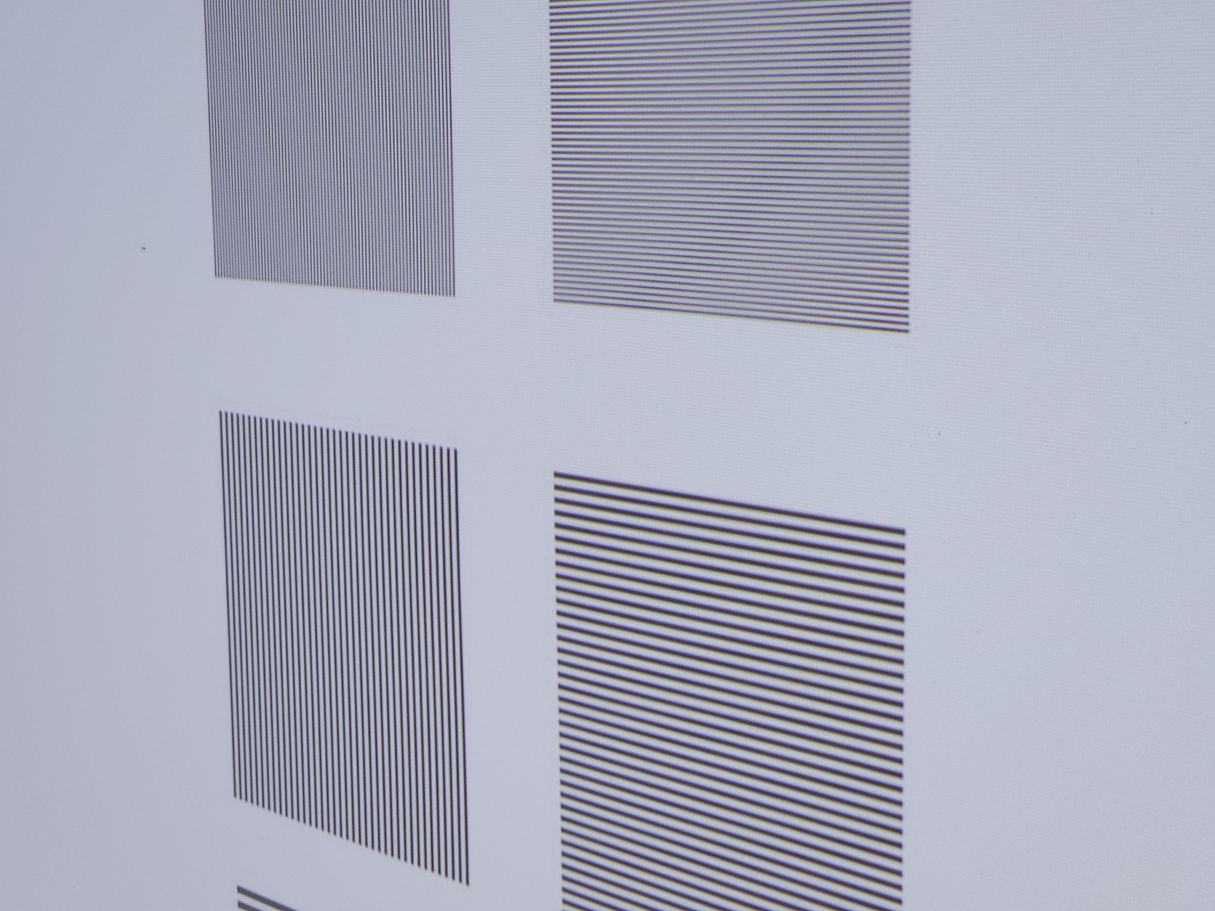 Ma première impression sur la netteté de ce projecteur était bonne mais sans être exceptionnelle. C'est en testant la mise au point automatique que j'ai découvert l'utilité du petit bouton rouge sur la télécommande. Ce bouton permet un réglage fin de la netteté et là, tout a changé. Le réglage de la netteté permet d'obtenir un niveau de netteté d'un niveau exceptionnel. Les lignes écartées de 1 pixel sont parfaitement visibles, il n'y a pas le moindre défaut visible. Sur les photos, vous verrez de temps en temps des formes bizarres, mais elles sont apparues quand j'ai redimensionné les images. En réalité, les traits verticaux et horizontaux sont impeccablement nets.