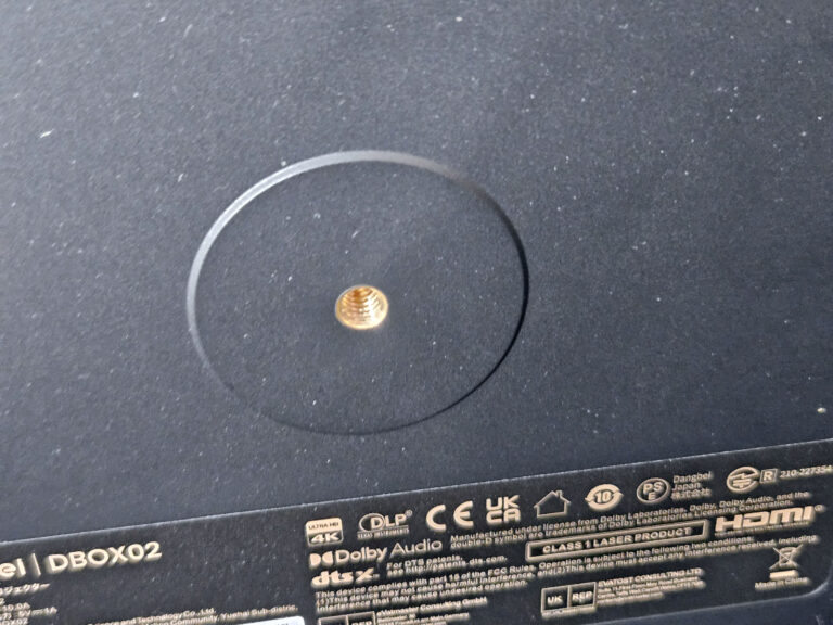 Si vous voulez fixer le projecteur sur un trépied c'est également possible. Vous avez la possibilité d'utiliser le pas de vis standard qui se trouve en dessous du projecteur. Vu la taille du projecteur, je vous conseille de prendre un trépied à trois pieds pour assurer un équilibre maximal.