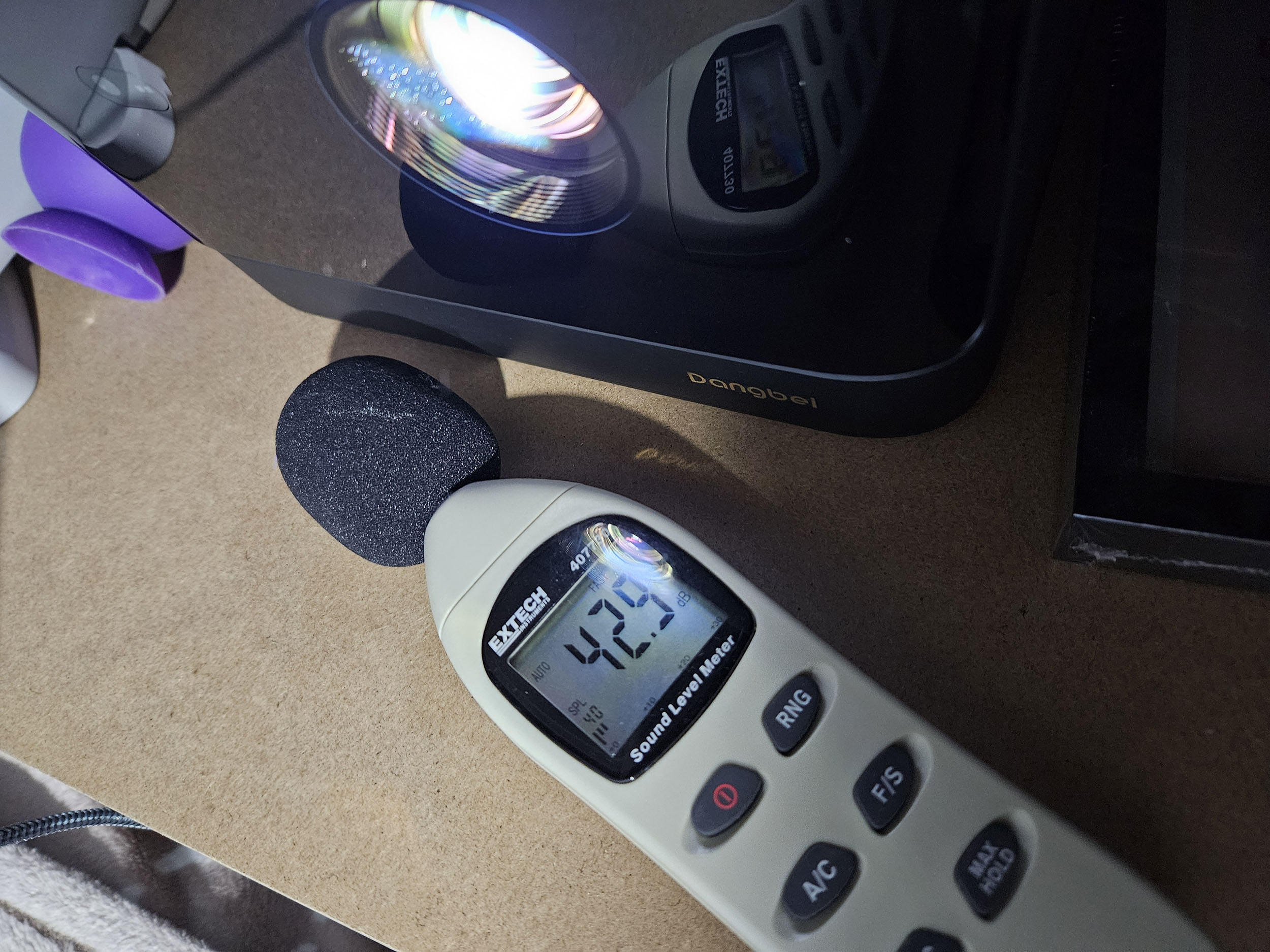 Le Dangbei Mars Pro 2 n'est pas très bruyant mais le niveau de bruit n'est pas constant, il fluctue en fonction des besoins de ventilation. J'ai mesuré un peu plus de 40 décibels à proximité du projecteur et moins de 35 dB à distance mais le niveau sonore peut parfois augmenter un peu. C'est un peu la même chose que sur le Valerion Visionmaster Plus 2, j'aurais préféré que le bruit soit constant pour moins le remarquer lorsqu'il se met en route.