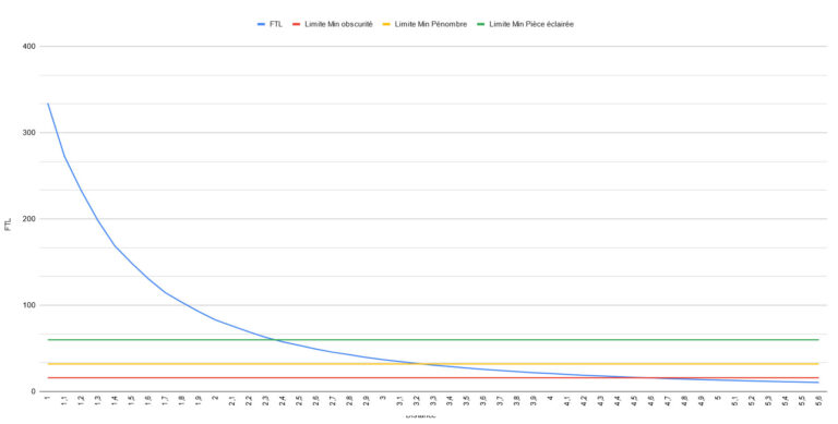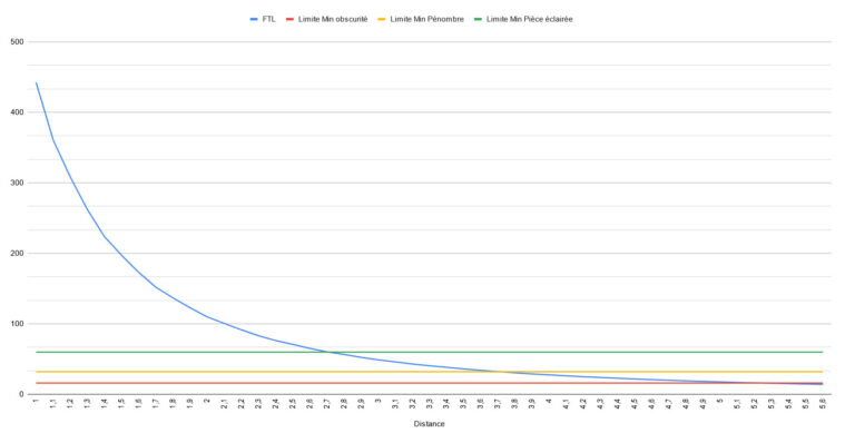 La distance joue aussi un rôle sur la luminosité car la luminosité décroit avec le carré de la distance. Un projecteur placé à 4 mètres perdra donc 4 fois de plus de luminosité qu'un projecteur placé à 2 mètres.
