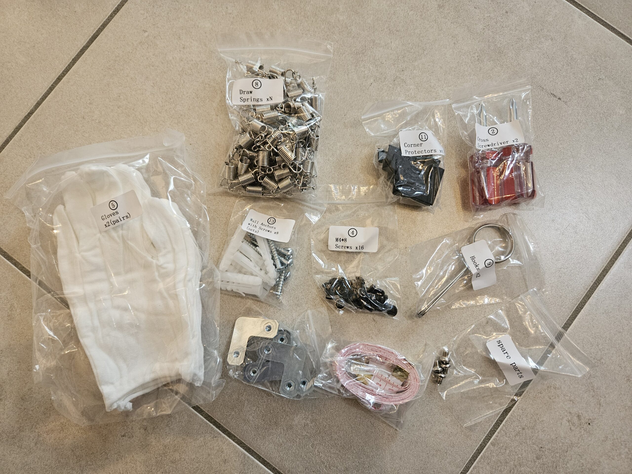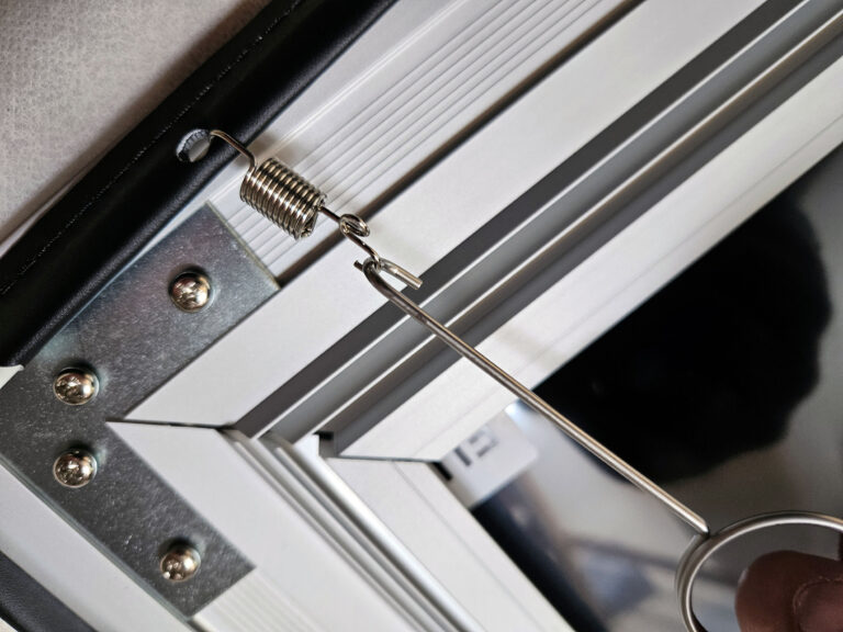 Une fois les baguettes installées, vous devrez attacher tous les ressorts mais attention, ne le faites pas n'importe comment car il faut créer une tension progressivement en alternant le côté où vous installez les ressorts. Le manuel indique le sens, il faut commencer par un coin et ensuite faire le coin opposé et à chaque fois procéder de la même manière. C'est une partie assez longue et parfois il faut forcer un peu les ressorts pour les accrocher solidement au cadre. C'est l'étape essentielle pour obtenir une toile parfaitement tendue, c'est aussi l'étape la plus longue.