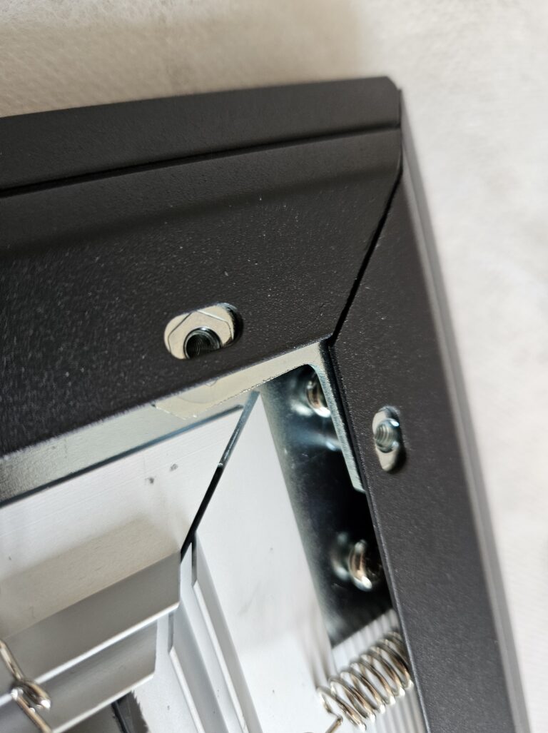 il faut ensuite fixer le cadre noir de finition tout autour de l'écran. Placer ce cadre n'est pas compliqué mais par contre insérer les angles de fixation m'a vraiment faire perdre du temps parce que je n'arrivais pas à faire rejoindre les coins du cadre. J'avais eu le même problème avec mon premier écran NothingProjector, j'ai l'impression que c'est pire avec cette version parce que le système d'attache est un peu différent. Il faut donc un peu forcer le cadre pour qu'il ne laisse pas trop d'espace au niveau de chaque joint.