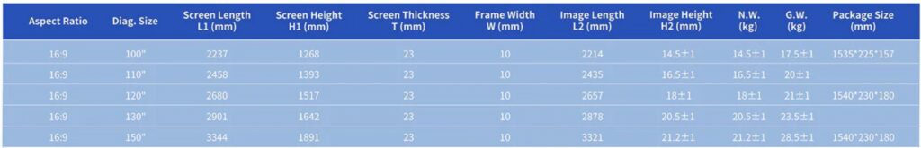 J'ai testé la version 100 pouces de cet écran, il existe au total 5 versions : 100 / 110 / 120 / 130 / 150 pouces. Pensez donc bien à vérifier les dimensions avant d'acheter parce qu'une fois monté, un écran est très encombrant et difficile à déplacer. Le poids est par contre très raisonnable, le soulever ne posera donc pas de problème mais il vaut quand même mieux être deux pour le déplacer histoire d'éviter d'abimer l'écran.
