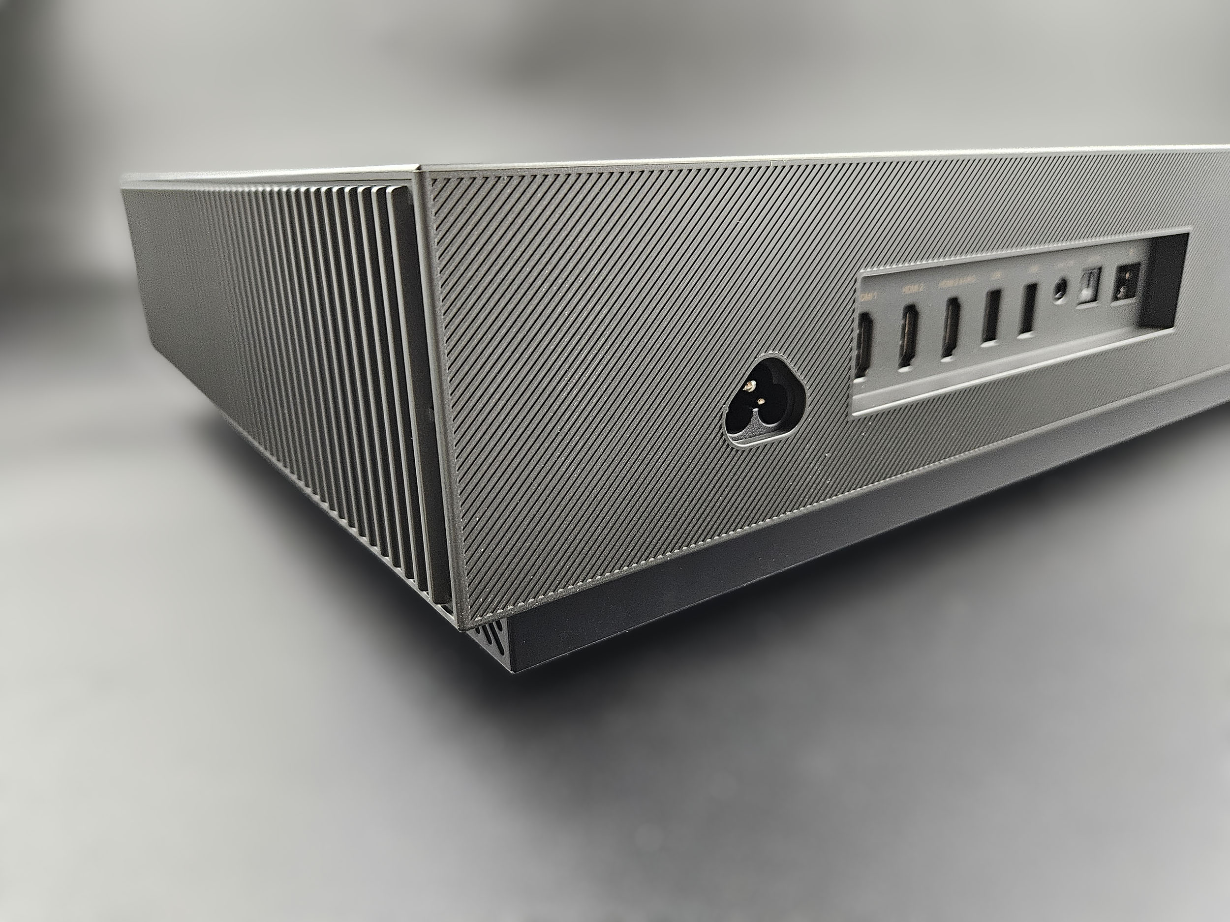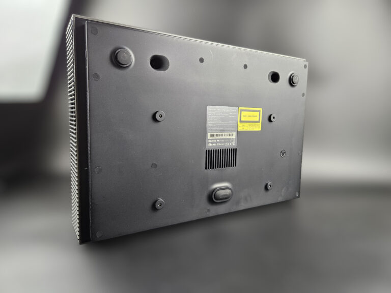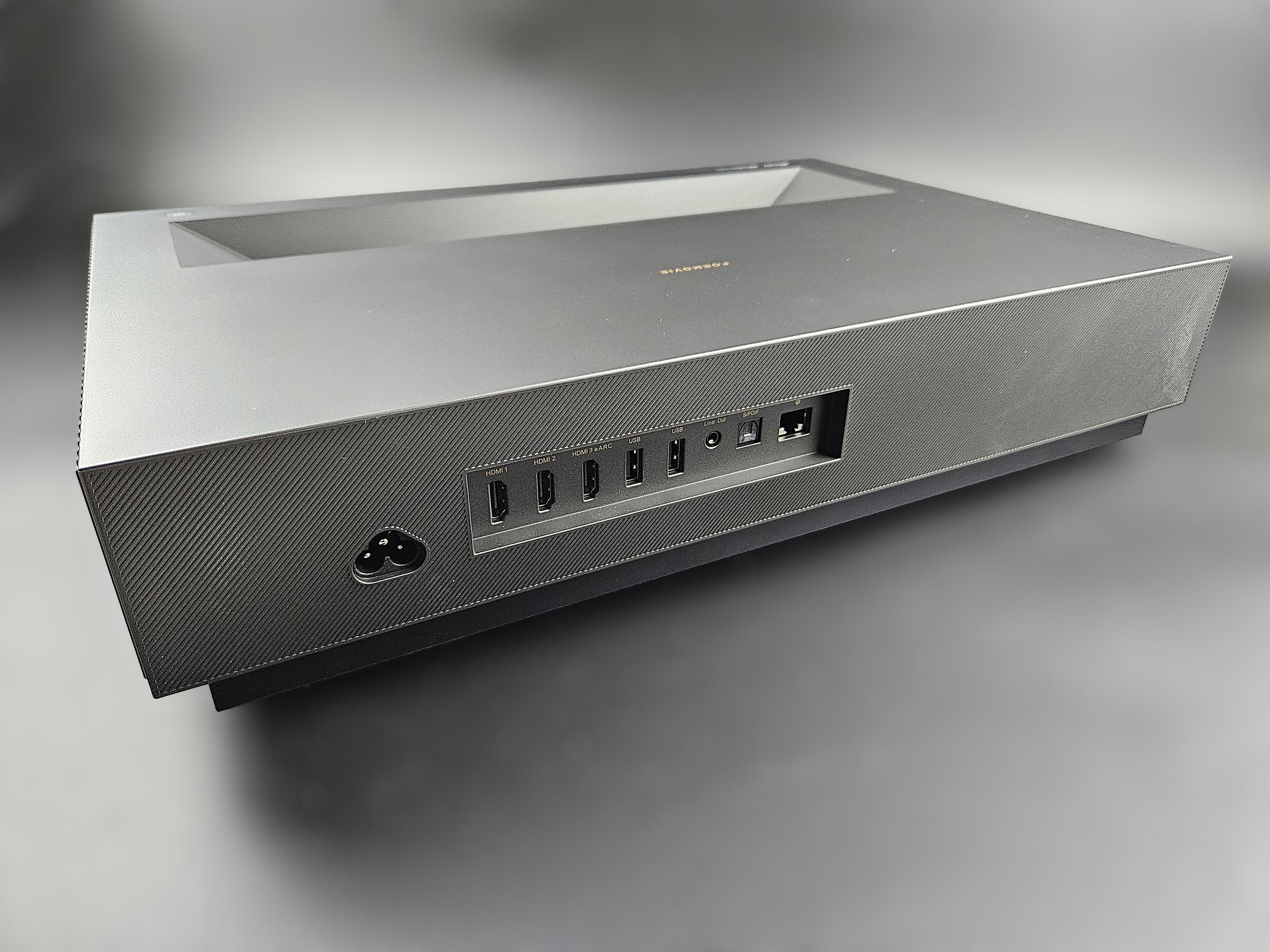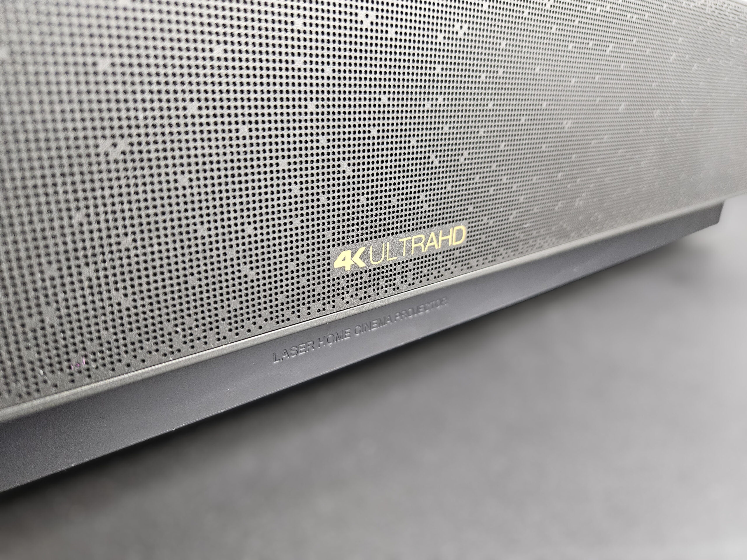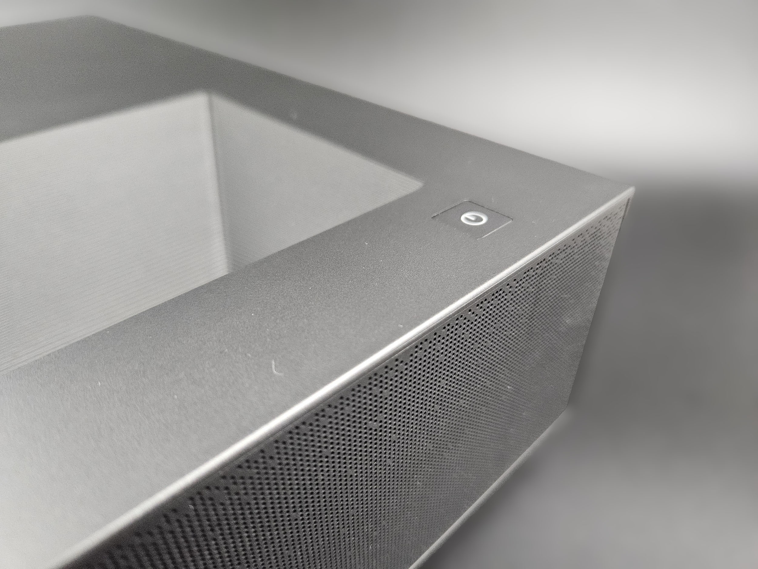La façade avant est recouverte d'une grille "pixelisée" qui recouvre les enceintes. On retrouve une grille sur le côté pour l'évaluation de la chaleur. Il y a également une petite roulette permettant de régler la hauteur des pieds au cas où l'orientation du projecteur devrait être adaptée. Si vous utilisez un meuble du type Shore RolaTV, il faudra juste vous assurer que les pieds puissent être posés sur une partie non trouée du tiroir mécanique.