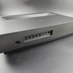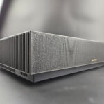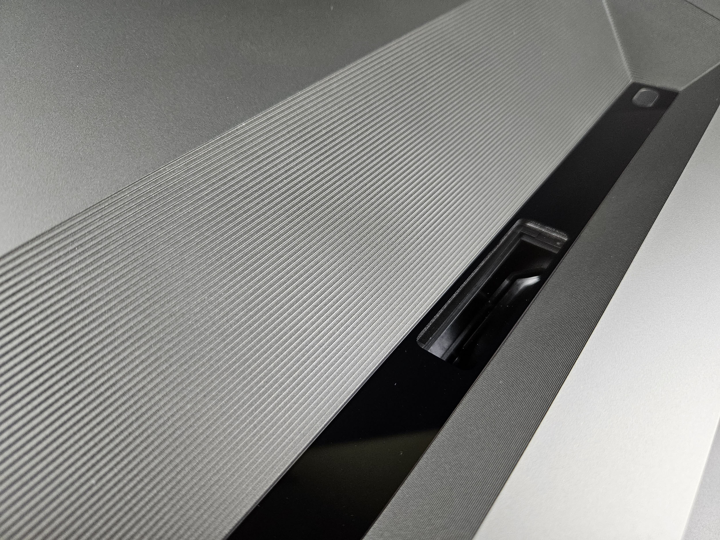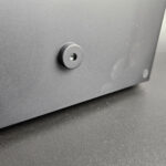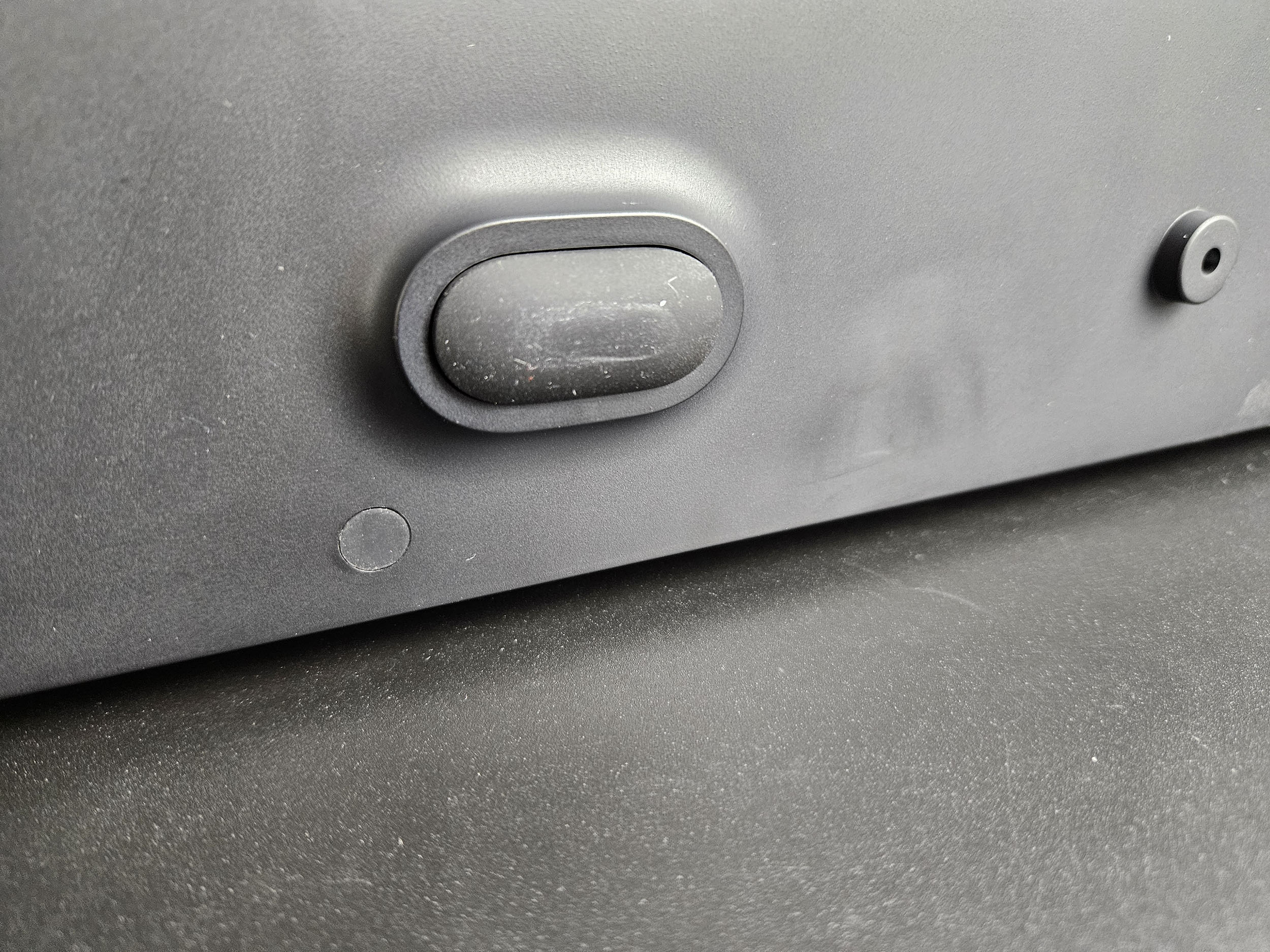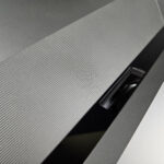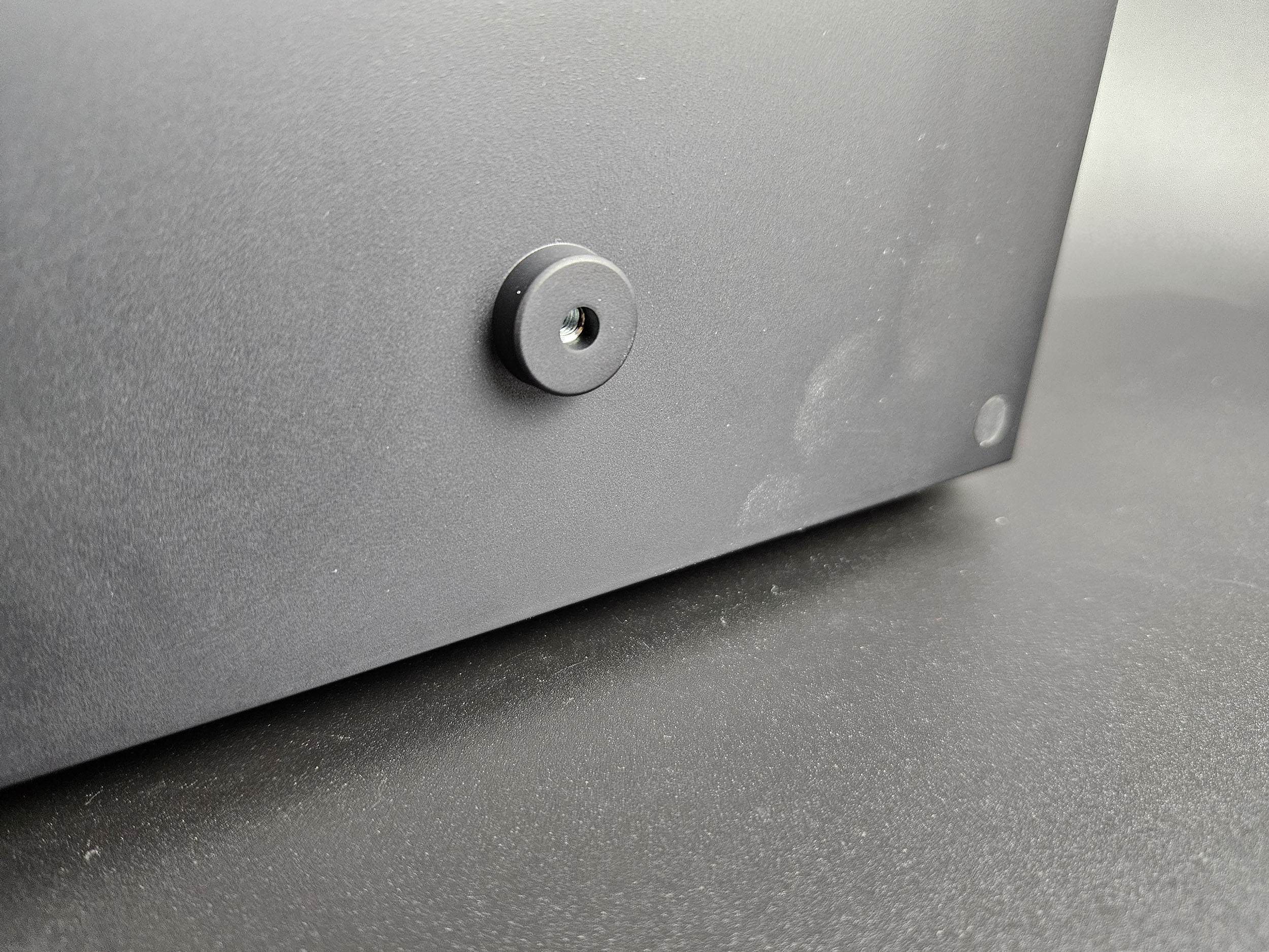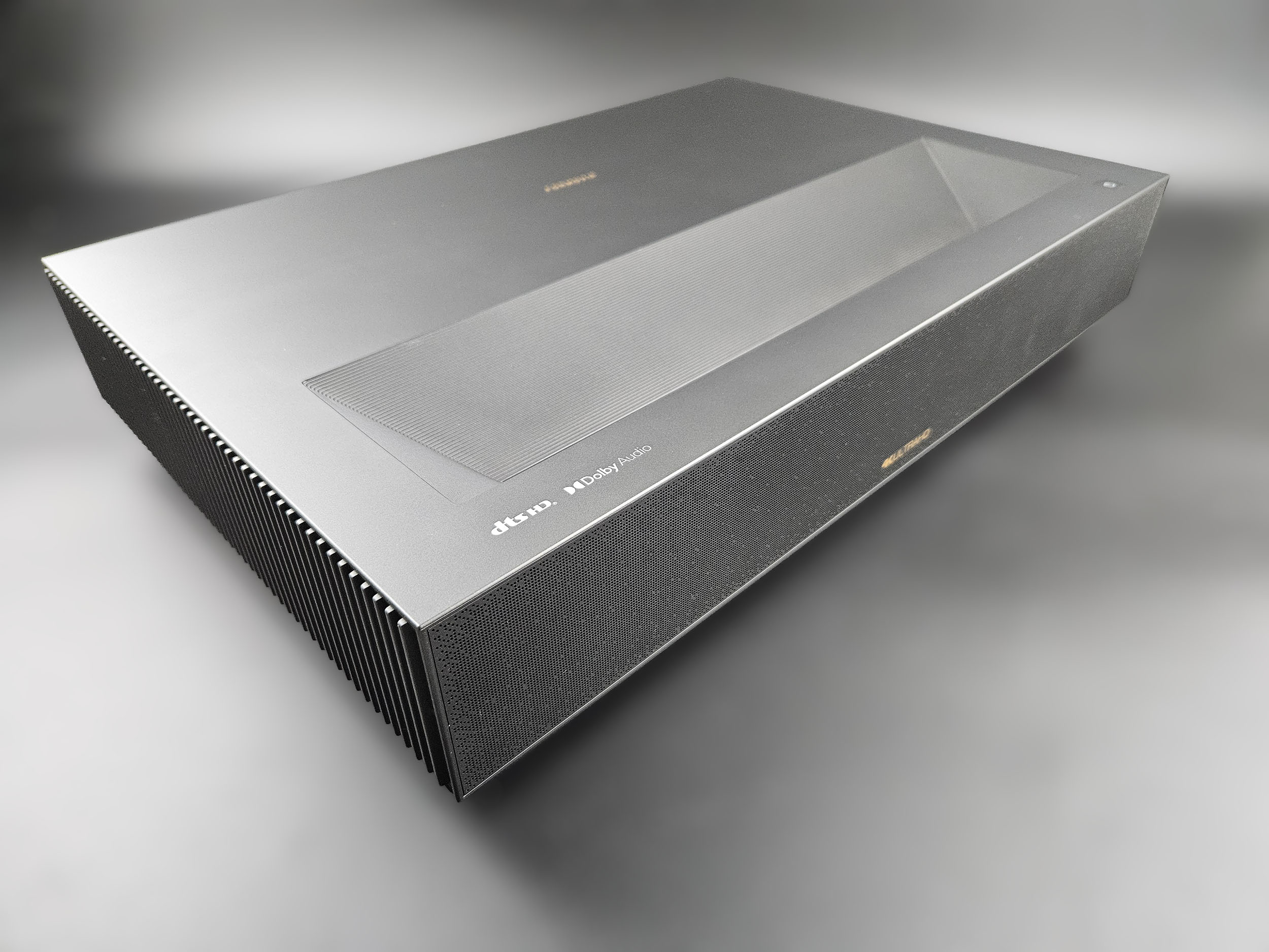 La façade avant est recouverte d'une grille "pixelisée" qui recouvre les enceintes. On retrouve une grille sur le côté pour l'évaluation de la chaleur. Il y a également une petite roulette permettant de régler la hauteur des pieds au cas où l'orientation du projecteur devrait être adaptée. Si vous utilisez un meuble du type Shore RolaTV, il faudra juste vous assurer que les pieds puissent être posés sur une partie non trouée du tiroir mécanique.