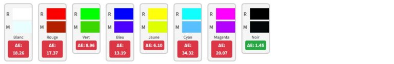 Le blanc est bleuté, le rouge trop foncé et vire vers le brun, le vert trop foncé, le bleu vire vers le mauve, le jaune vire vers le vert, le cyan vire vers le bleu et le magenta vers le mauve. Les dE sont beaucoup trop élevés pour être ignorés.