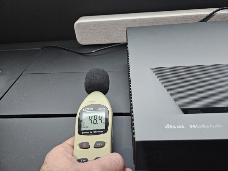 Les projecteurs à focale ultra-courte émettent souvent un petit ronronnement (sauf dans le haut de gamme). J'ai mesuré ici presque 50 dB à la sortie du projecteur, c'est plus que la moyenne, le ronronnement est donc bien perceptible. Si par contre je m'éloigne un peu, le ronronnement descend en dessous des 40 db, il est encore perceptible mais uniquement quand le projecteur n'émet pas de son.