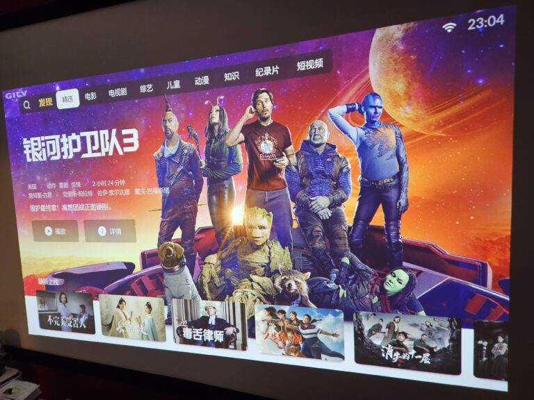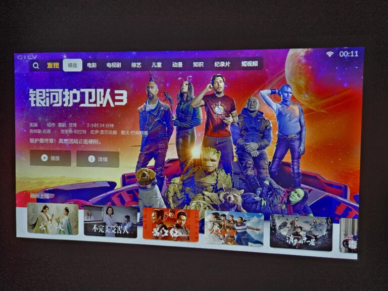 Comme le reste de l'interface et le contenu sont en chinois, cela n'a donc pas beaucoup d'intérêt pour un utilisateur hors de Chine. Il faut donc associer une solution externe à ce projecteur comme par exemple une Google Chromecast TV ou une Nvidia Shield (j'ai utilisé ces deux solutions pour tester le projecteur).