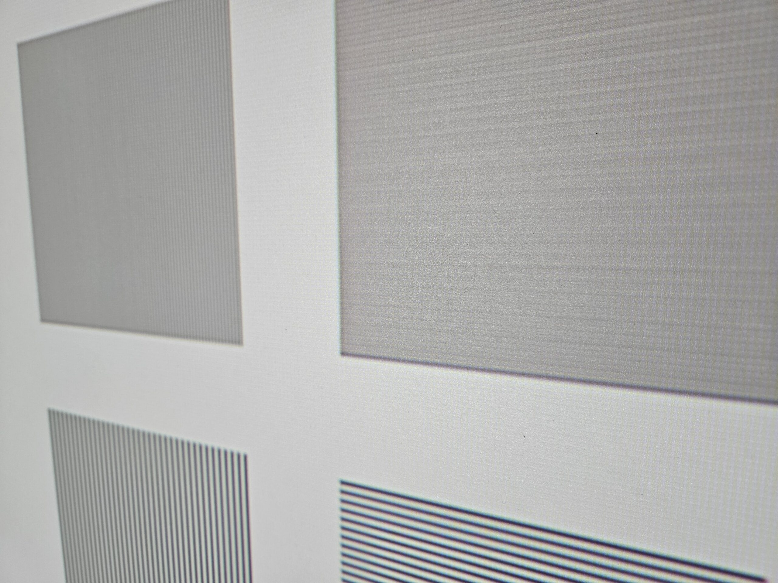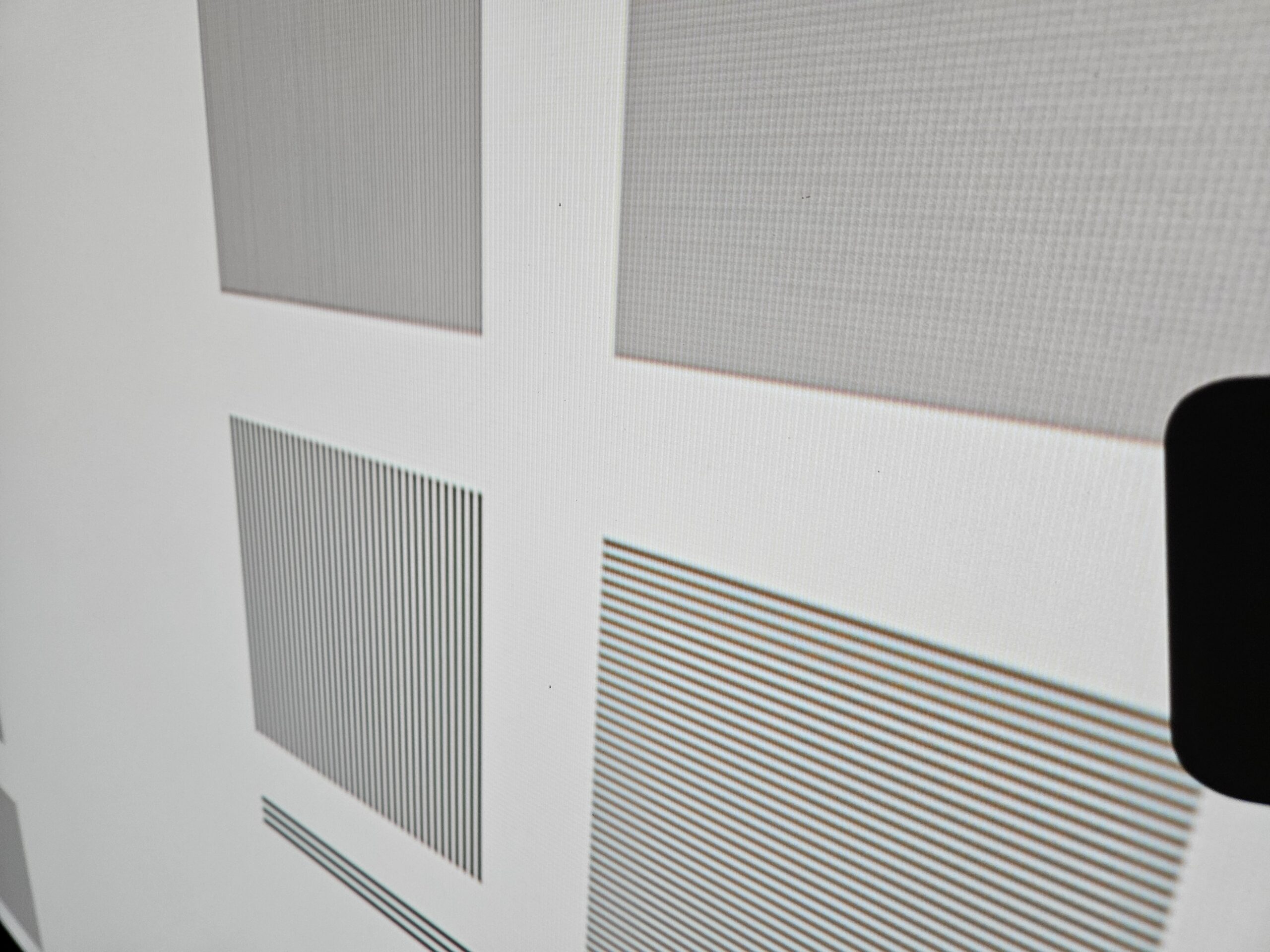 La netteté de ce projecteur est bonne à condition de ne pas trop s'éloigner de la surface de projection. Pour mes tests, mon projecteur se trouvait presque à 3 mètres et à cette distance le projecteur montre ses limites. On voit sur les images suivantes qu'on ne peut plus vraiment distinguer les lignes à 1 pixel et que de l'aberration chromatique est visible.