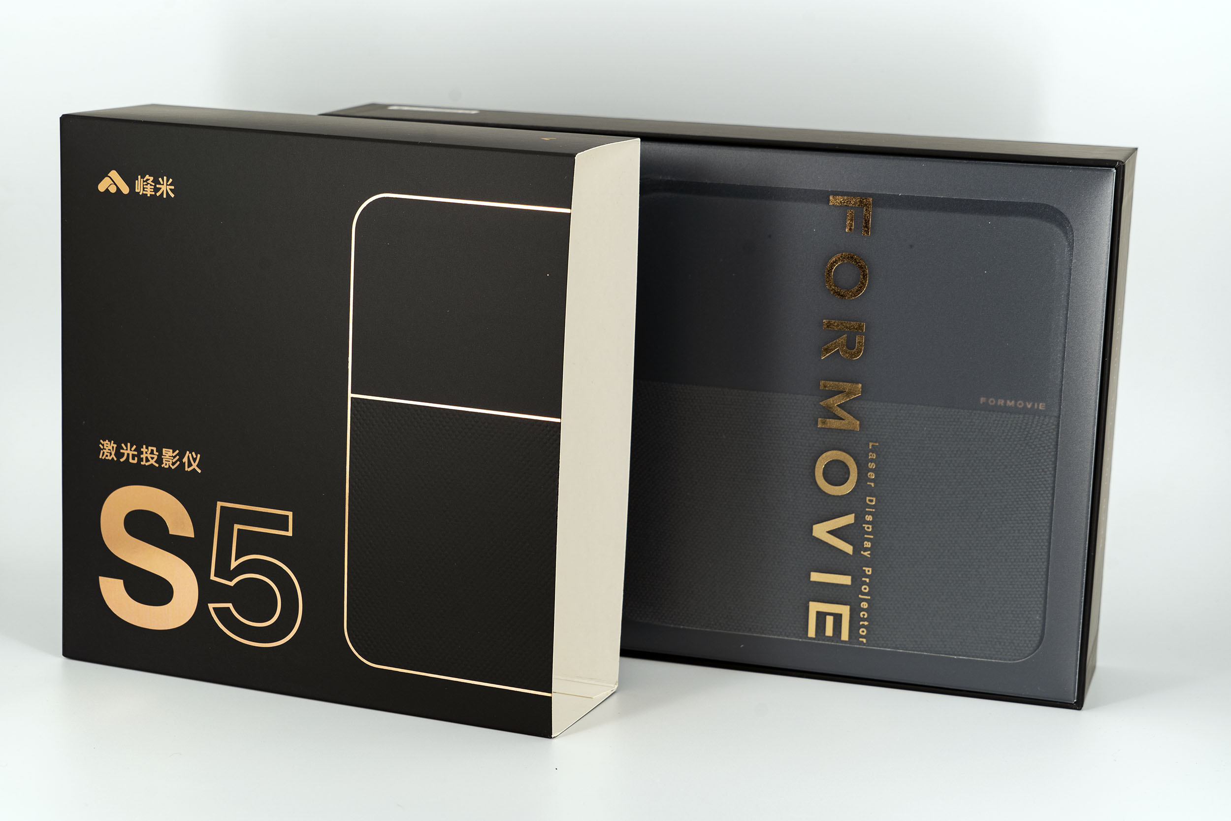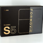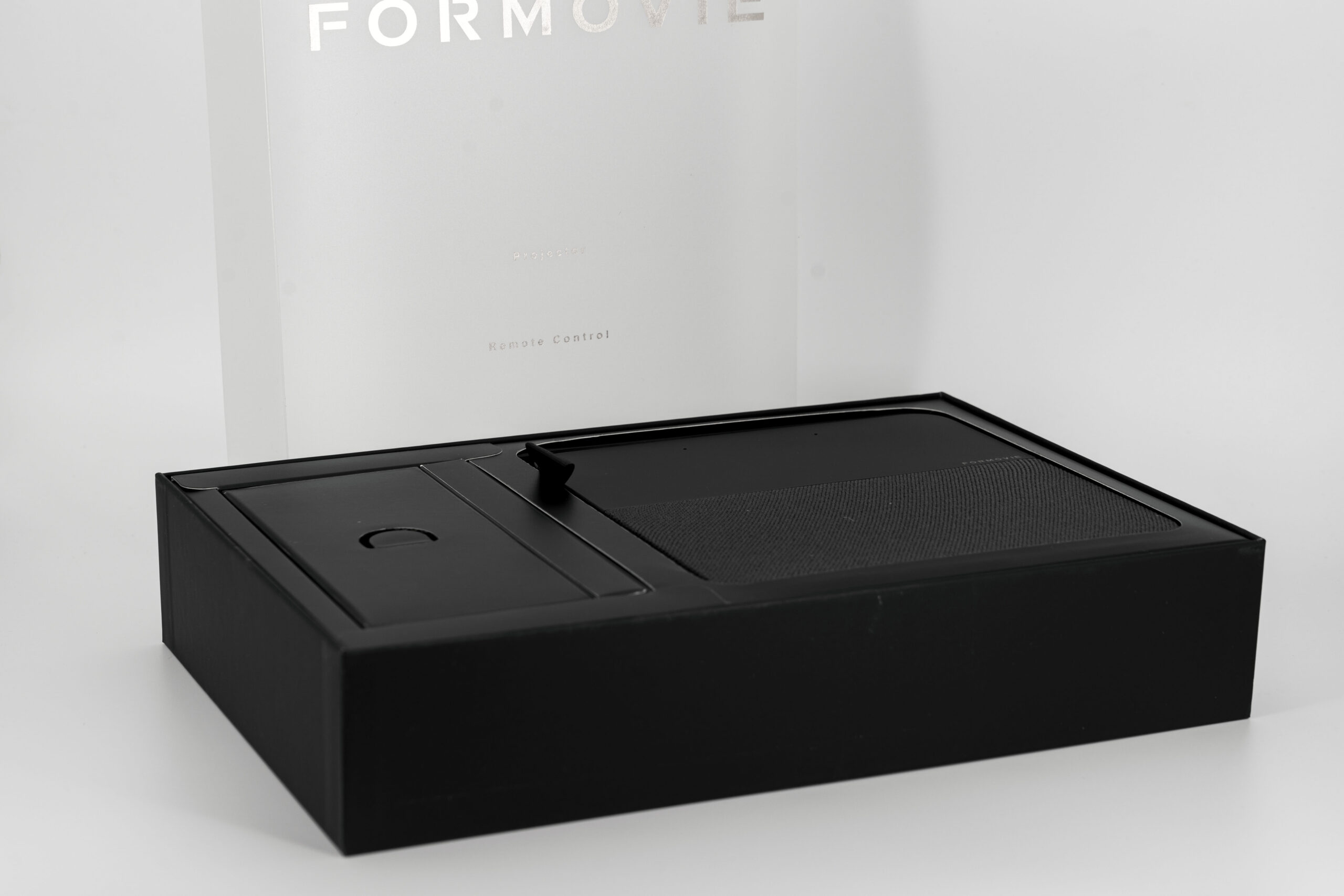 La boite du Formovie S5 est sobre et élégante, le choix du noir avec un lettrage doré donne une indication sur le positionnement que la marque veut prendre. On est ici loin d'un produit chinois de base. La boite ne s'ouvre pas comme la plupart des boites, il faut faire glisser l'emballage en carton pour accéder au contenu de la boite et le contenu est encore protégé par une épaisse couche de plastique.
