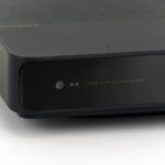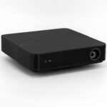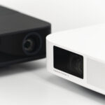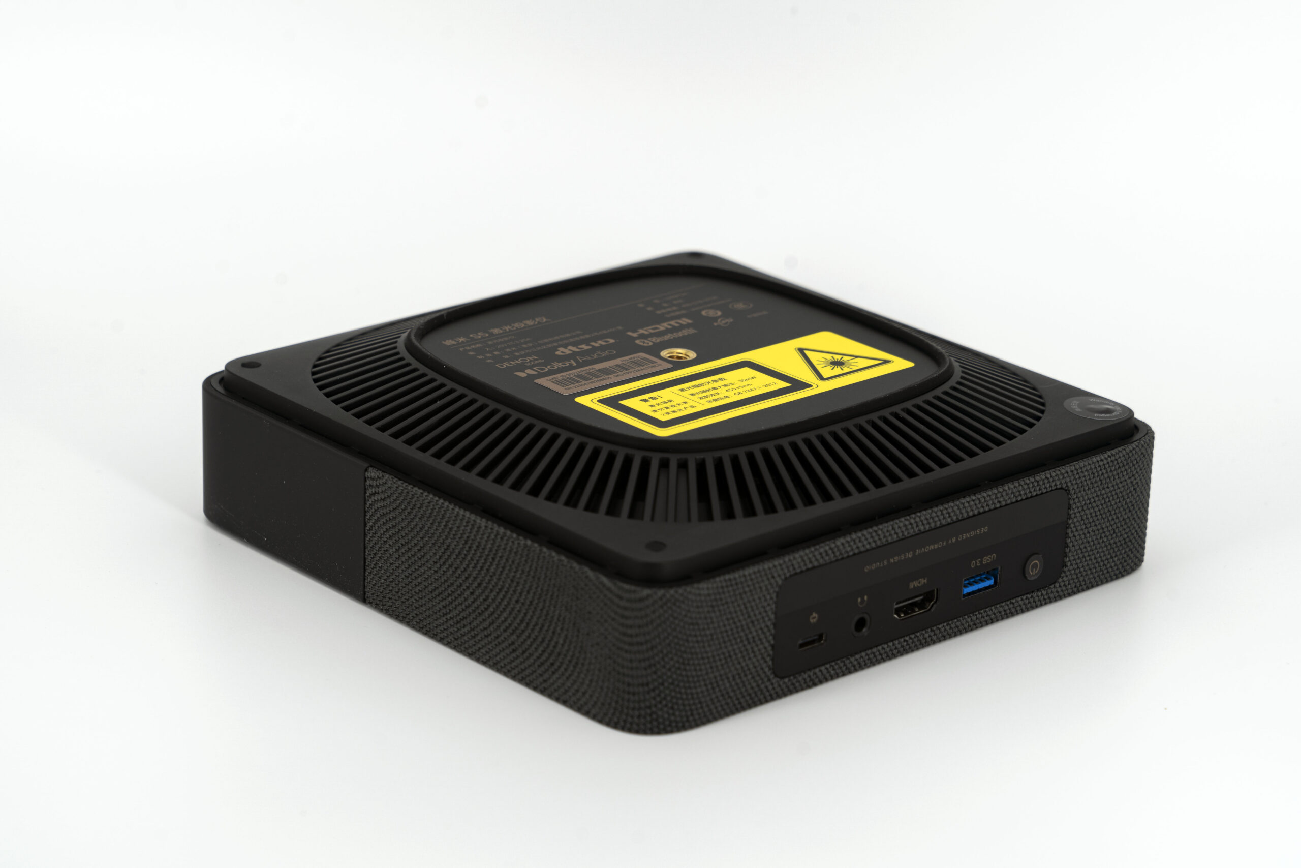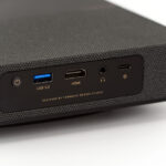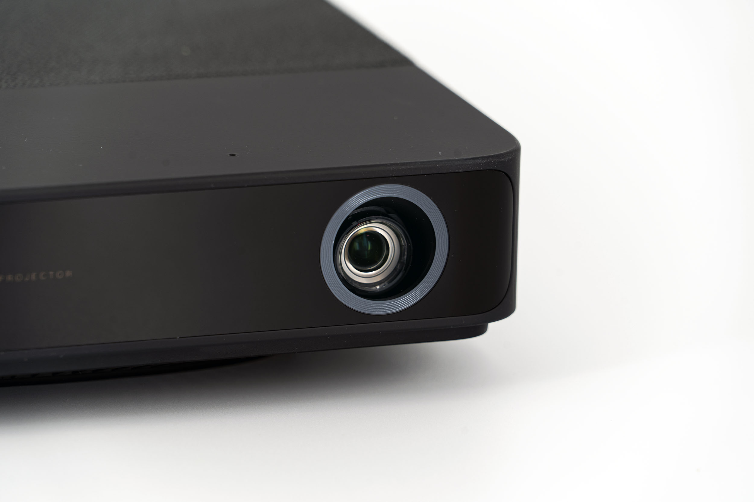 Sur la façade avant on retrouve le bloc optique qui cache une puce DMD 0.23 comme le XGIMI Mogo 2 Pro mais l'apport d'une source laser au lieu de LED pour le XGIMI. Cette puce DMD a une résolution de 1280 × 720, ce n'est donc pas vraiment un projecteur full HD mais Formovie (et les autres constructeurs) obtiennent une résolution full HD en combinant plusieurs images très rapidement. Vous obtenez au final une image full HD de bonne qualité à condition de ne pas projeter une image trop grande. Je reviendrais sur ce point plus tard dans ce test.