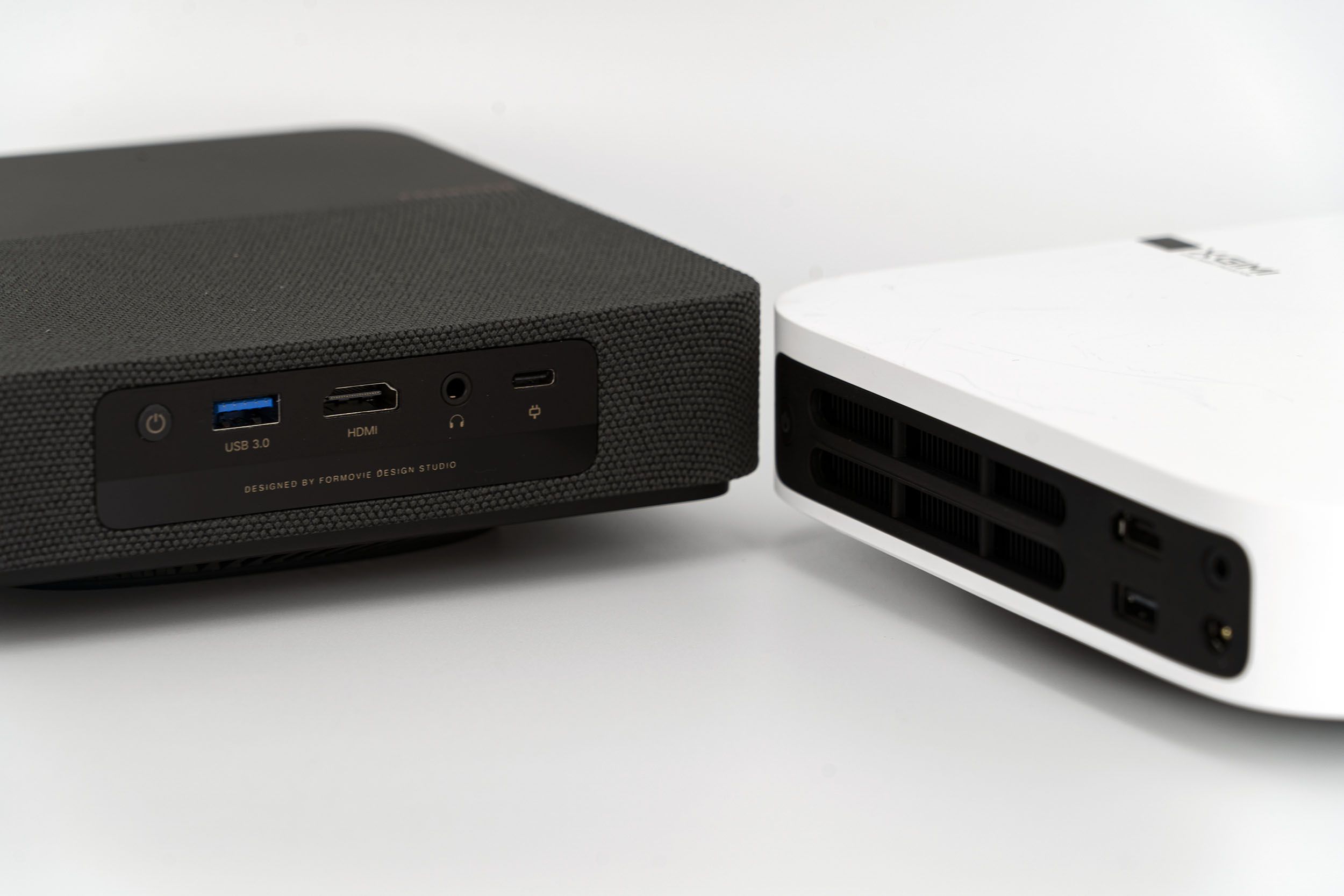 Ce projecteur est un concurrent direct du XGIMI Elfin, je vais comparer ces deux projecteurs dans ce test afin de vous aider à choisir lequel est le plus adapté pour votre situation. Les projecteurs ont une esthétique assez différente mais le format est au final très similaire. Le XGIMI est un peu plus grand et son port USB à l'arrière est un port usb 2.0.