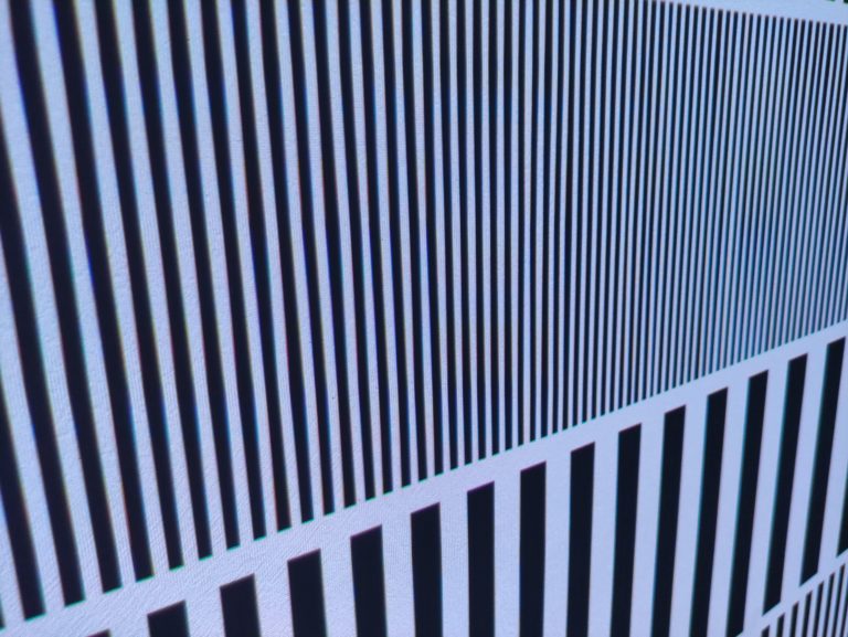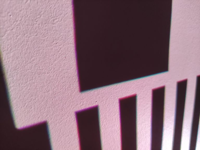 Je teste la netteté des images avec des images statiques et des vidéos en 4k stockées localement. La netteté est bonne sur l'ensemble de l'image, on voit bien la distinction entre les traits sur l'image ci-dessous, il y a juste ce débordement de rouge et de vert qui est franchement ennuyant surtout sur les zones à fort contraste comme sur cette photo. Tous les textes blancs sur fond noir ont le même problème, le vert et le rouge débordent dans la zone blanche.