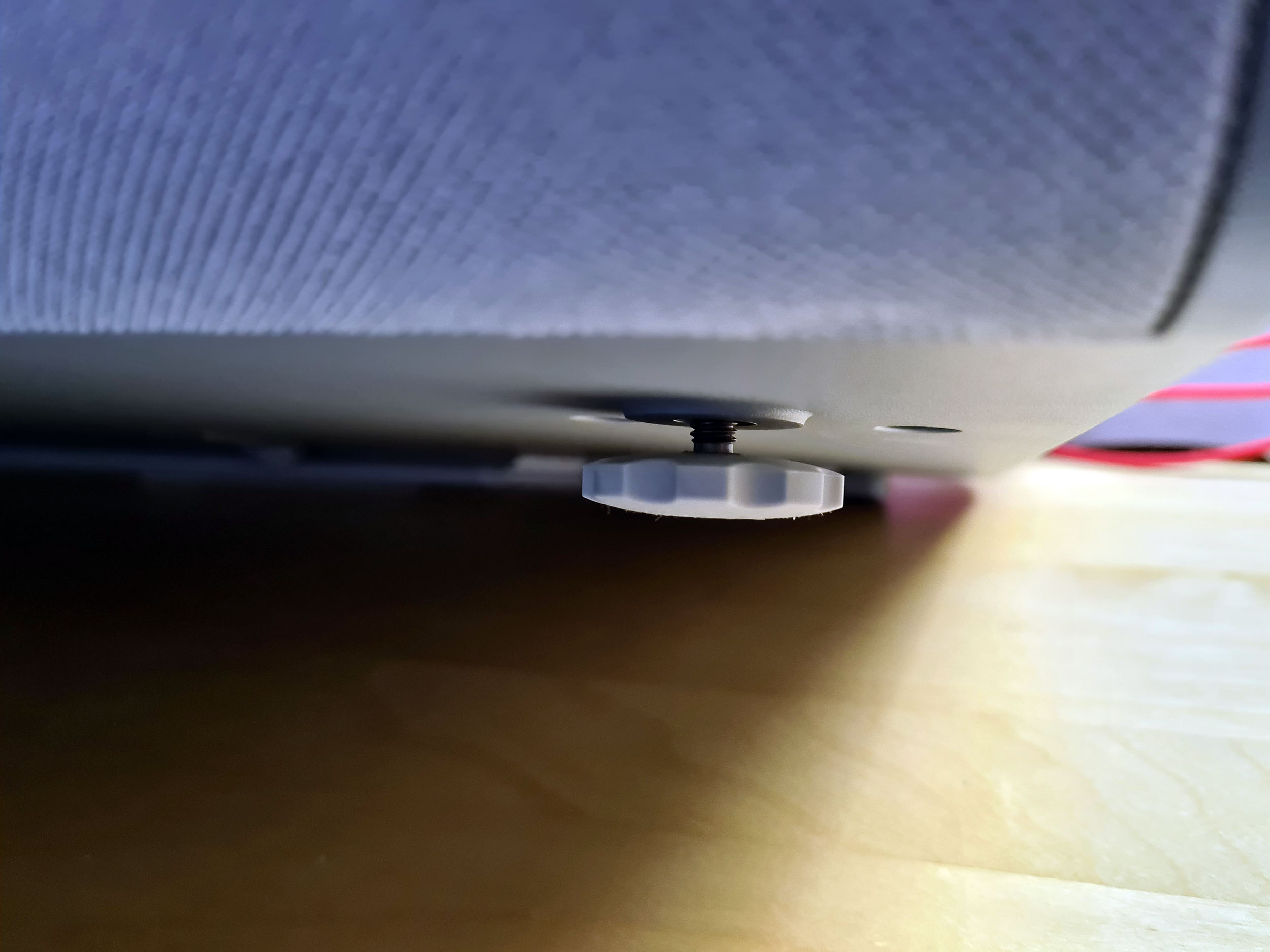 En dessous du projecteur on retrouve deux roulettes permettant de modifier l'inclinaison du projecteur et adapter la position de celui-ci pour une projection optimale. Le projecteur ne dispose malheureusement pas de zoom ni de correction en trapèze permettant d'adapter l'image à votre écran. Si vous inclinez trop le projecteur, l'image prendre un effet de perspective un peu comme dans un générique Star Wars.