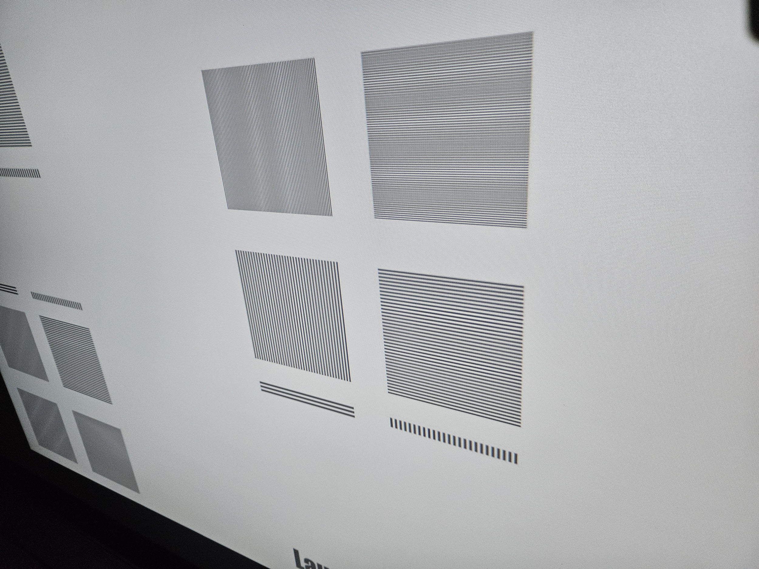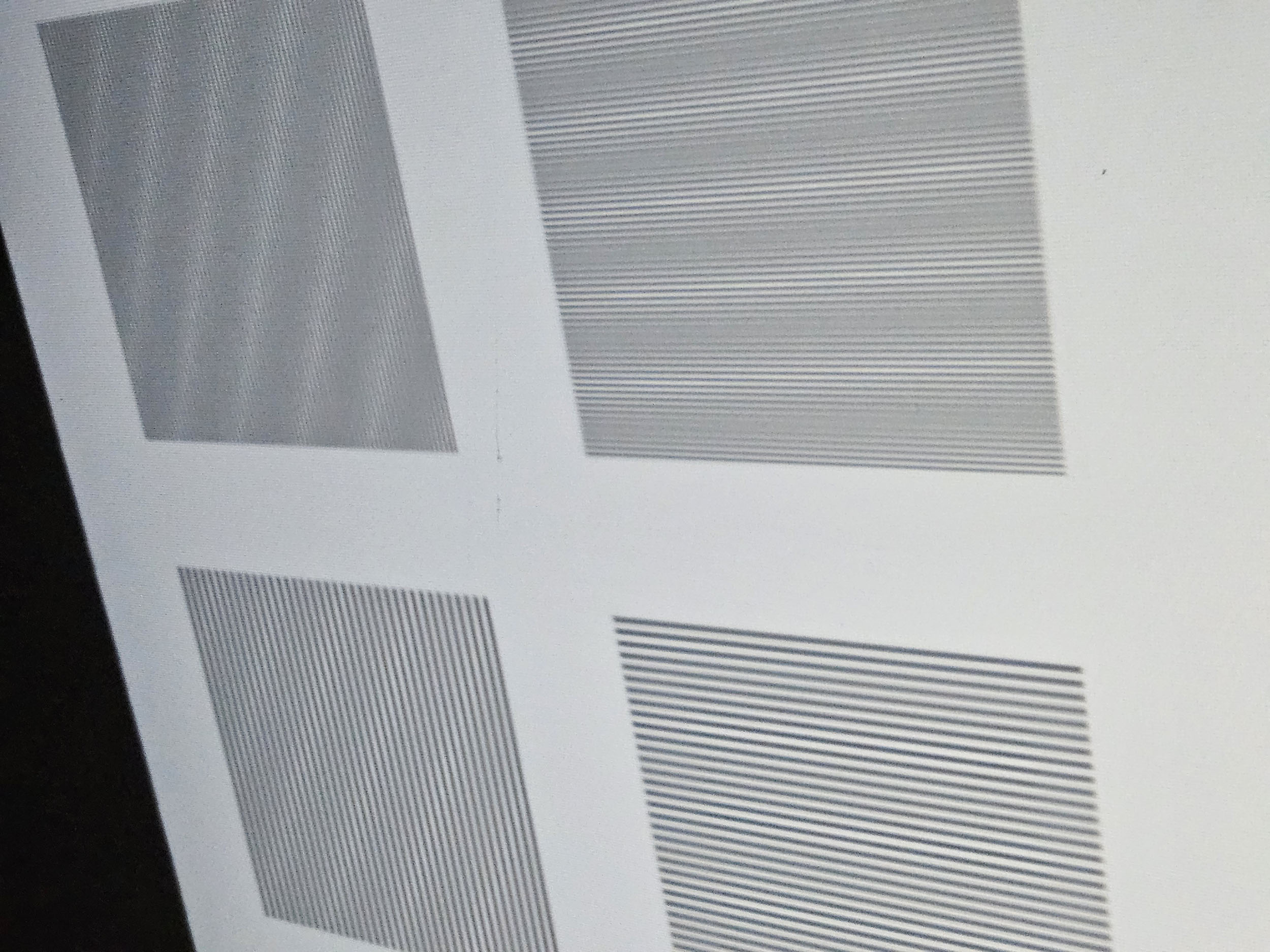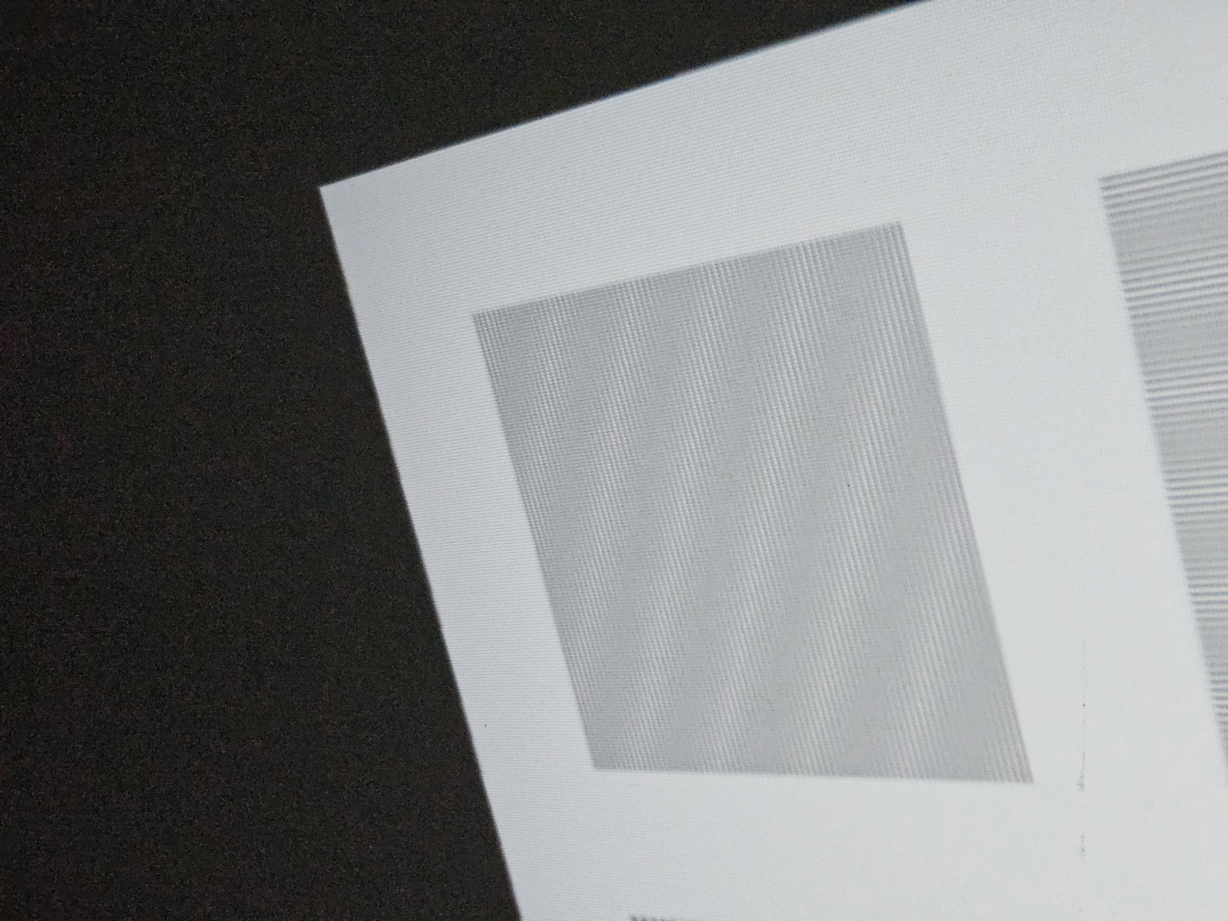 Voici des photos prises pour évaluer la netteté à partir de lignes horizontales et verticales, on voit clairement apparaitre du moiré sur les carrés avec un écart de 1 pixel.