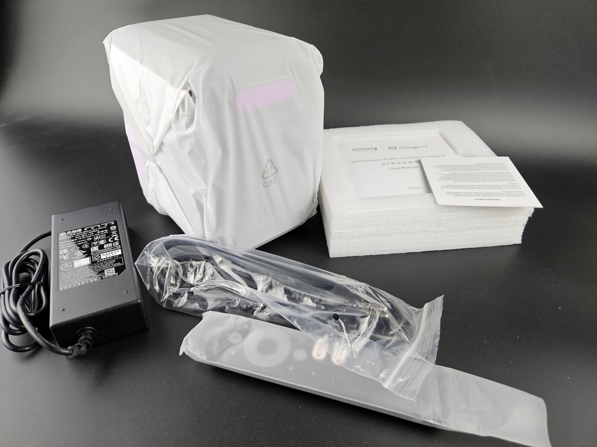 La boite du vidéoprojecteur NothingProjector NP One Smart est assez basique et contient l'essentiel de ce dont vous avez besoin. Il y a évidemment le projecteur, soigneusement emballé, un transformateur et un cable d'alimentation, une télécommande (livrée sans piles, 2x AAA) et un manuel. La boite ne laisse pas paraitre qu'il s'agit d'un projecteur à moins de 200€.