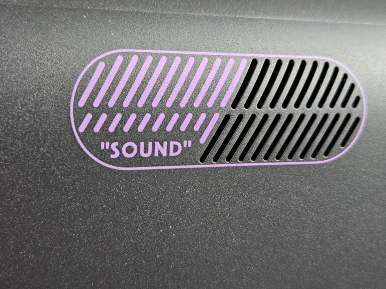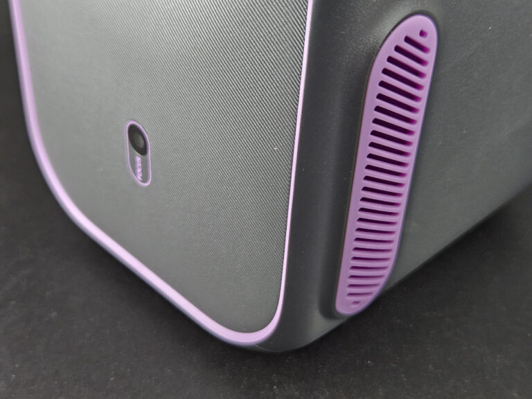 Sur les côtés on retrouve de larges ouvertures reprenant la couleur secondaire du projecteur. Ces ouvertures ne sont pas décoratives, elles ont pour vocation d'évacuer la chaleur du projecteur. Ce type de projecteur utilise souvent une lampe qui génère pas mal de chaleur et il faut donc dissiper la chaleur avec des ventilateurs et des évacuations de ce type. L'intégration de ces grilles est assez esthétique, on est loin des grilles type calandre de voiture comme sur certains autres projecteurs d'entrée de gamme.