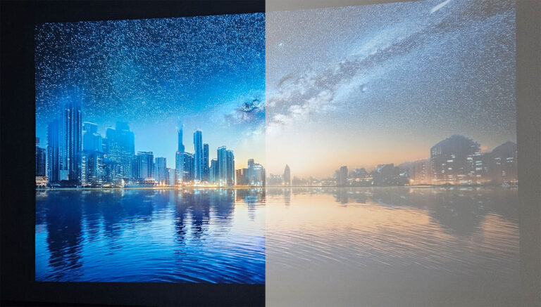 Le contraste (on/off) permet de mesurer l'écart entre le blanc et le noir. Cette mesure donne une indication sur la capacité d'un projecteur à produire un bon rendu dans les scènes sombres.