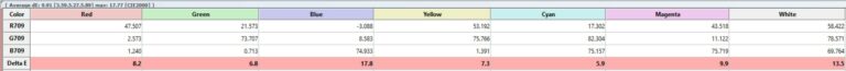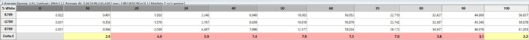J'ai obtenu un delta de 6.67 ce qui représente une amélioration importante mais c'est surtout sur le blanc que l'amélioration est la plus significative. Je suis passé d'un blanc à 13.5 et 7007 degrés kelvins à un delta E de 1.3 et 6651 kelvins. J'ai été positivement surpris par ce résultat parce que les possibilités de réglages sont assez limitées et je pense que c'est la première fois que j'arrive à obtenir un blanc aussi proche de la norme.
