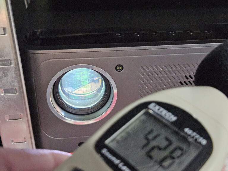 Les projecteurs LCD d'entrée de gamme sont souvent bruyants parce qu'ils doivent évacuer la chaleur générer par la lampe dans leur boitier. C'est également le cas de ce projecteur où je mesure un peu plus de 40 décibels à proximité du projecteur. Le bruit de ventilation est donc bien audible, ce n'est clairement pas le pire dans cette catégorie mais le bruit reste perceptible à 1 mètre du projecteur.