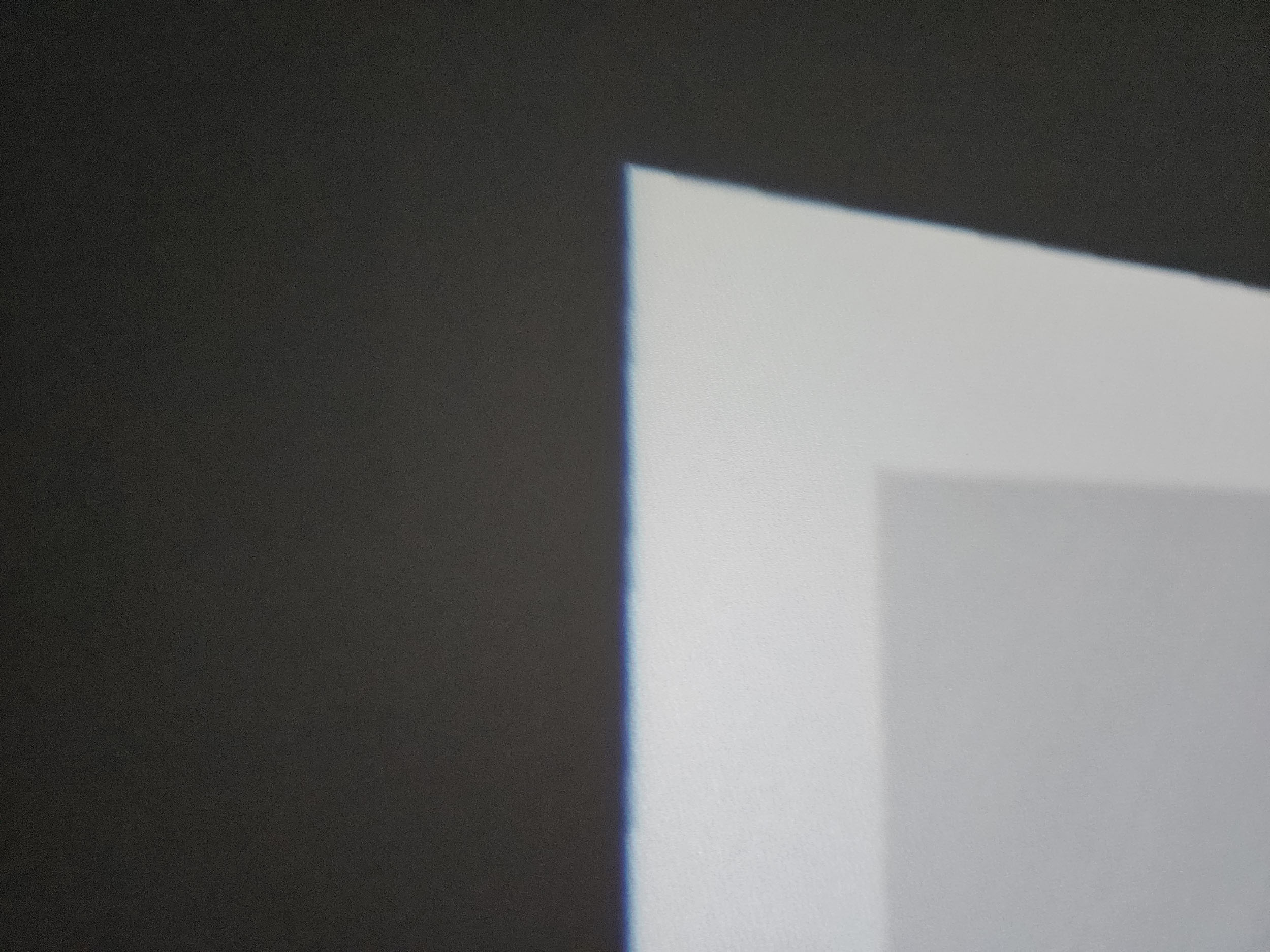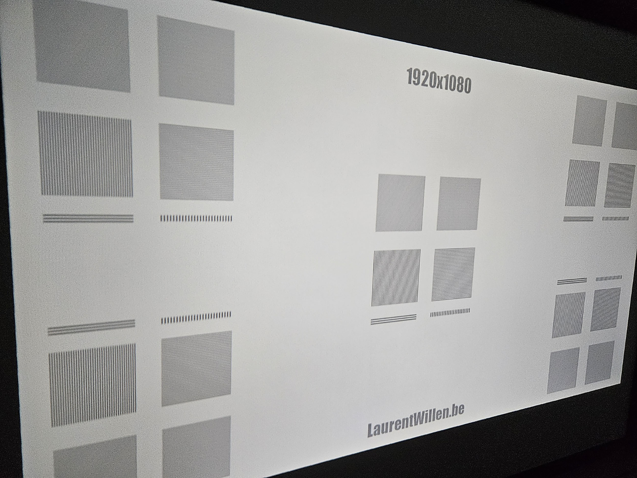 Tous les projecteurs de ce type sont équipés d'un gros bloc optique qui a une tendance à dégrader la luminosité et la netteté en périphérie. C'est également le cas avec ce ETOE Whale pro. Si vous regardez les images suivantes de plus près vous remarquerez sans doute que la distinction des lignes au centre est plus nette qu'en périphérie. Les images suivantes se concentrent sur la périphérie, la perte de netteté est particulièrement visible sur les coins où on ne distingue presque plus l'écart entre les lignes.