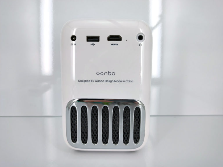 A l'arrière on retrouve la même grille qu'à l'avant et on y retrouve également une entrée pour l'alimentation, un port USB 2.0, un port HDMI (2.0?) et une sortie audio jack. C'est un projecteur portable, la connectique est donc limitée au strict minimum.