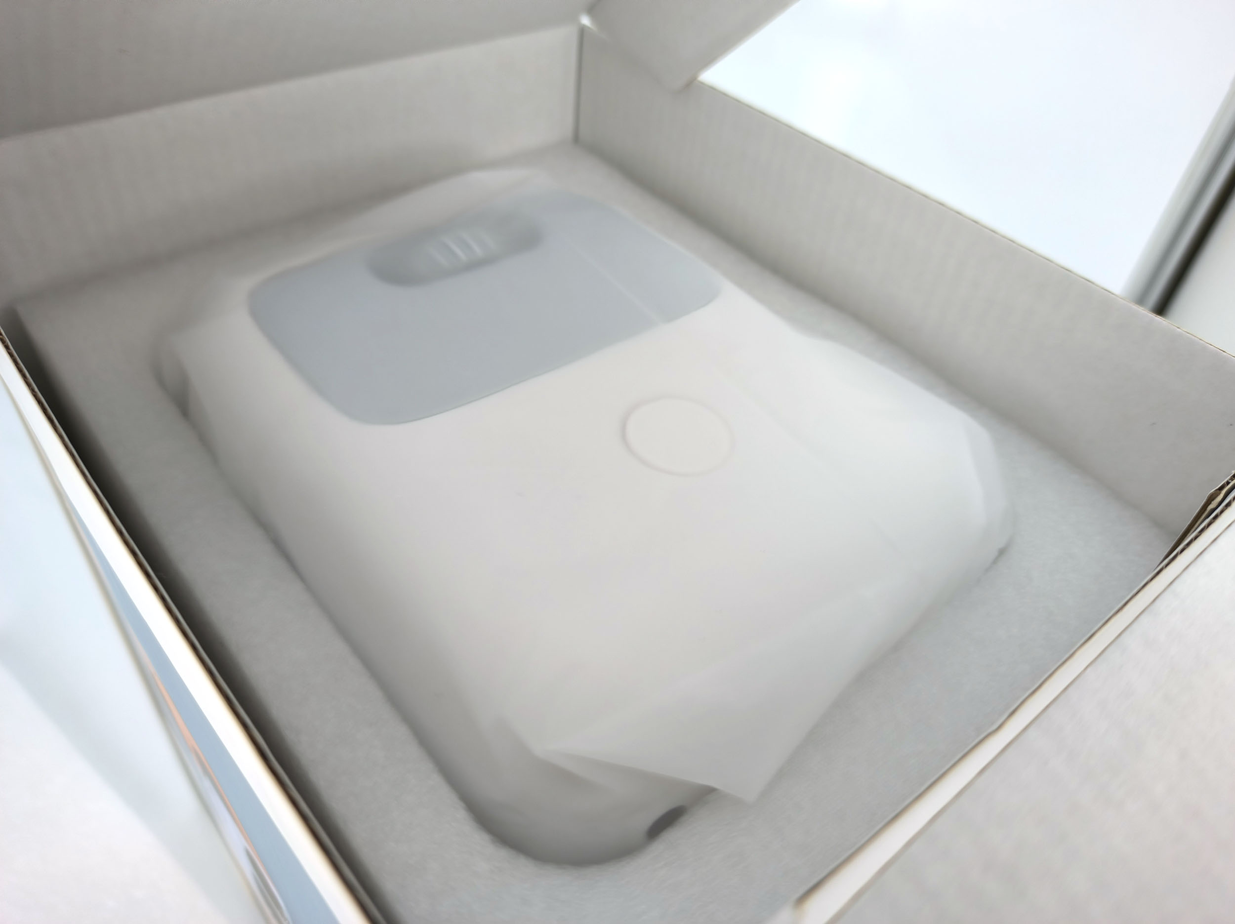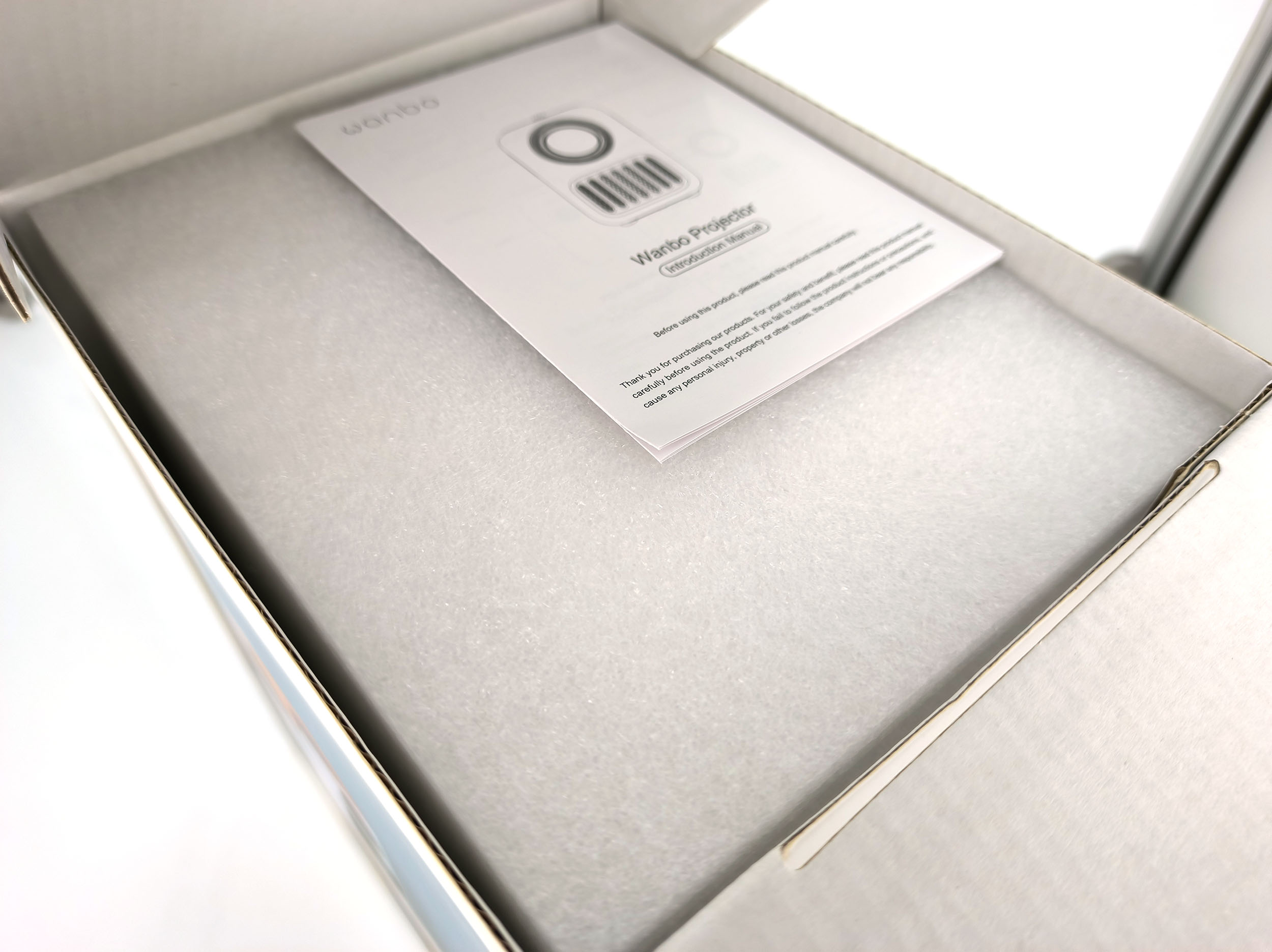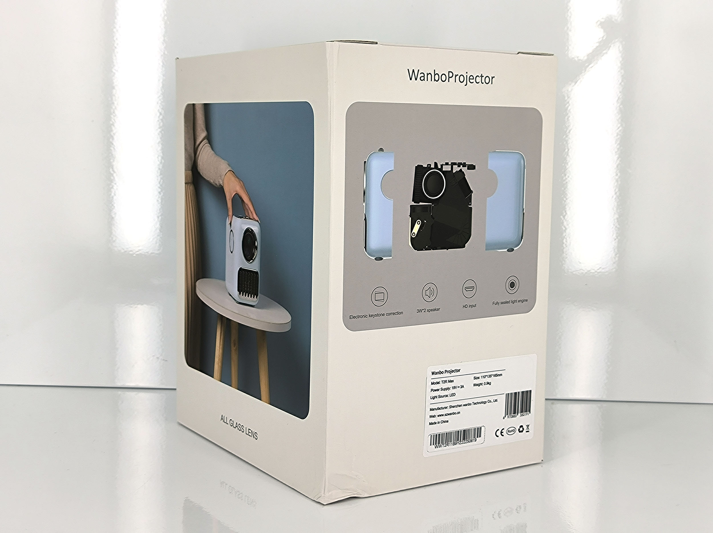 La boite du Wanbo suit un peu la forme du projecteur, elle est nettement moins imposante que celle du Wanbo T6 Max et je trouve que ce type de boite donne une bonne première impression sur le produit. Wanbo est une marque qui a atteint une certaine maturité dans la commercialisation de ses produits et cela se voit à la boite et aussi le soin apporté à l'emballage. La boite contient le projecteur avec une protection en mousse contre les chocs, une télécommande sans piles, un manuel, un autocollant Wanbo, une cable d'alimentation et son transformateur.