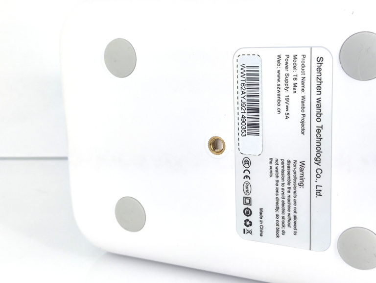 En dessous on retrouve un pas de vis qui permettra de fixer le projecteur sur un trépied ou utiliser un adaptateur pour l'accrocher au plafond. Le bas du bloc optique correspond au bas de l'image, vous devrez donc le poser assez bas pour le faire correspondre au bas de votre écran ou le mettre à l'envers en hauteur pour le faire correspondre au haut de l'écran.